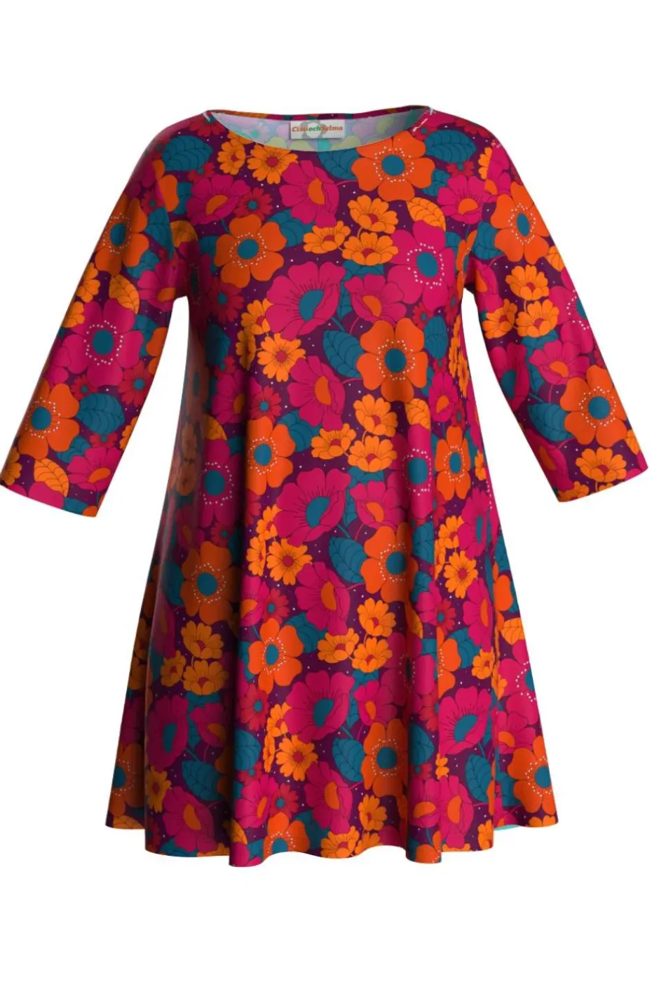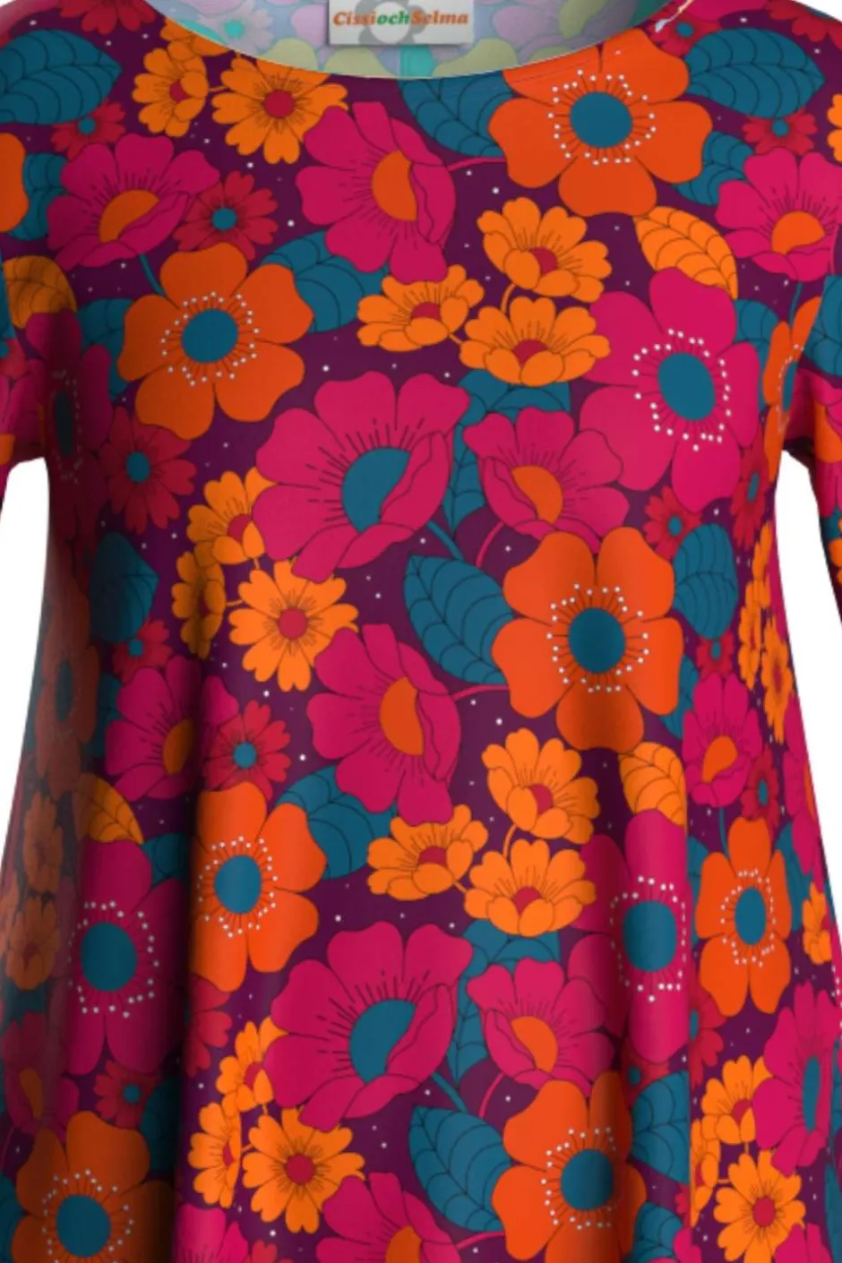 Tyget heter Humlesurr magenta. Det här är Cissi och Selmas klassiska blommönster som återkommer varje säsong i olika färgställningar, som denna variant där orange och magenta dominerar. Ett blommönster i underbar färgprakt i orange, blå och lila/rosa.