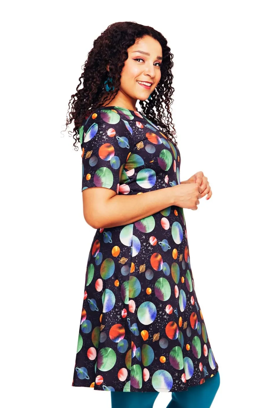 Irma är en klassisk klänningsmodell inspirerad av 50-talet med en båtringning, lite högre skärning i midjan och utställd kjol. Den har ärmar som slutar ovanför armbågen, dolda fickor i sidan och har foder i kjolen. Klänningen är lätt att komma i tack vare dragkedjan i ryggen. Tyget är lite stretchigt vilket gör klänningen skön att ha på sig. Bär den till vardags eller var snyggast på festen!