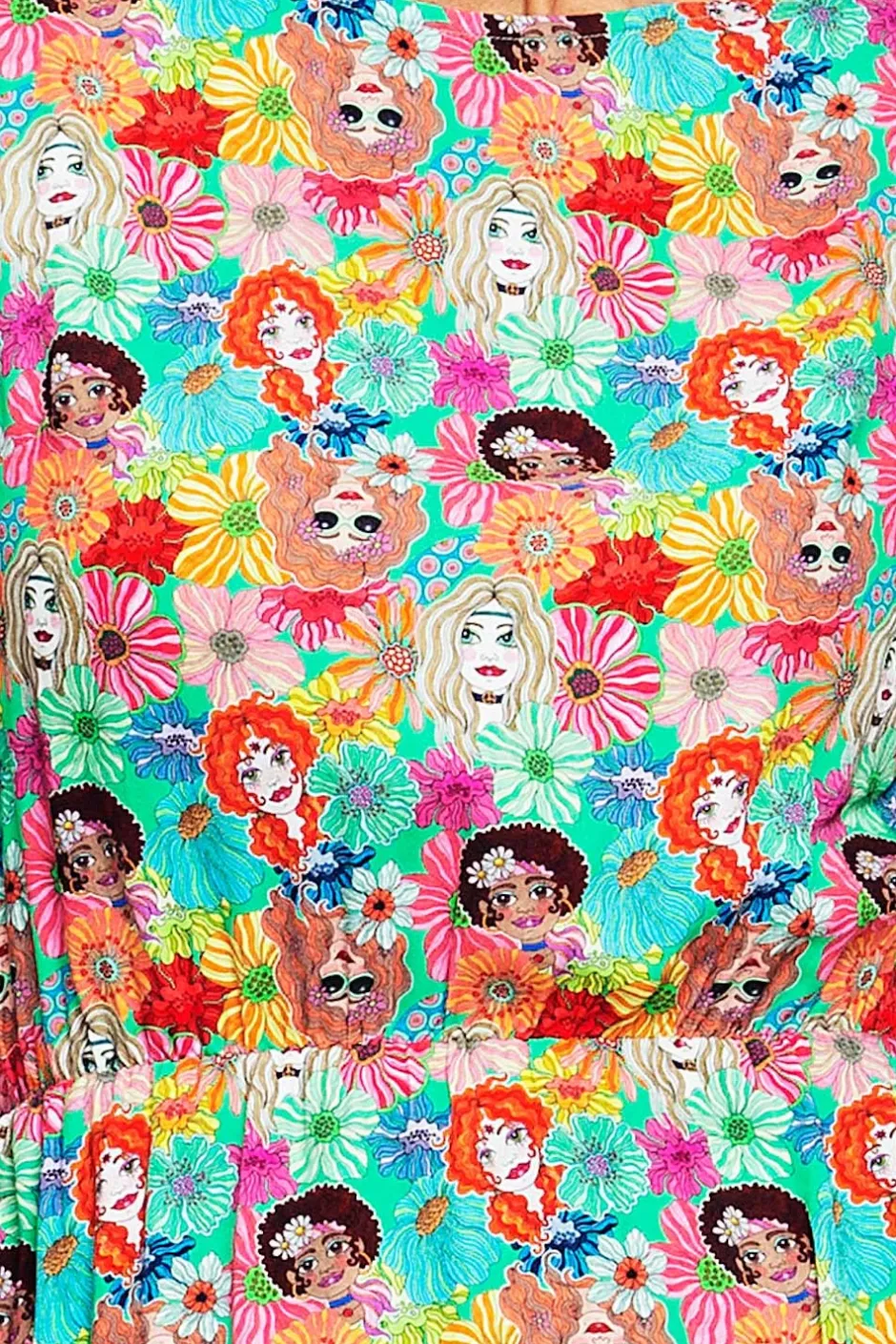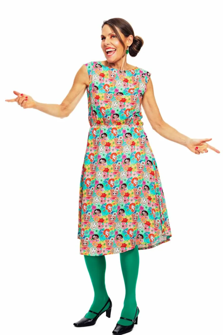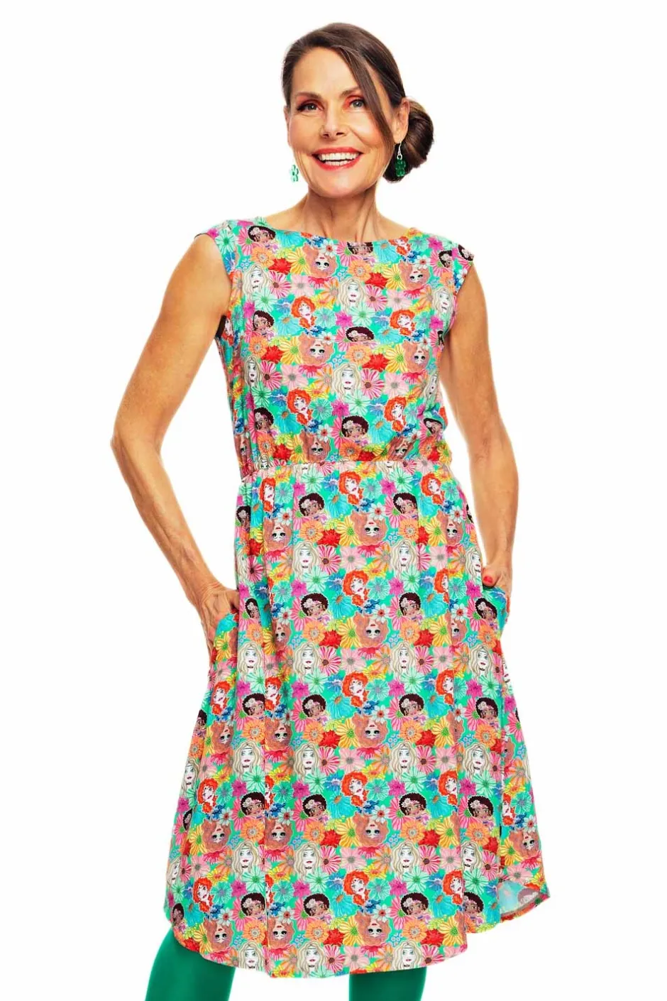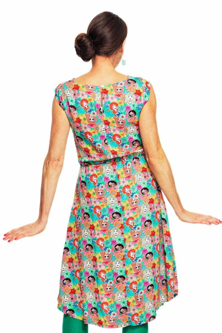 Malin är en luftig, något längre klänning i viskos, som slutar strax under knät och är från vår egen Cissi och Selma kollektion. Klänningen har en fin holkärm, resår i midjan samt dolda fickor i sidan. Kjolen på klänningen är bågformad vilket gör att den är längre fram och bak men något kortare i sidorna. Tyget heter Systrar och har en grön botten med randiga blommor och tjejer på sig.