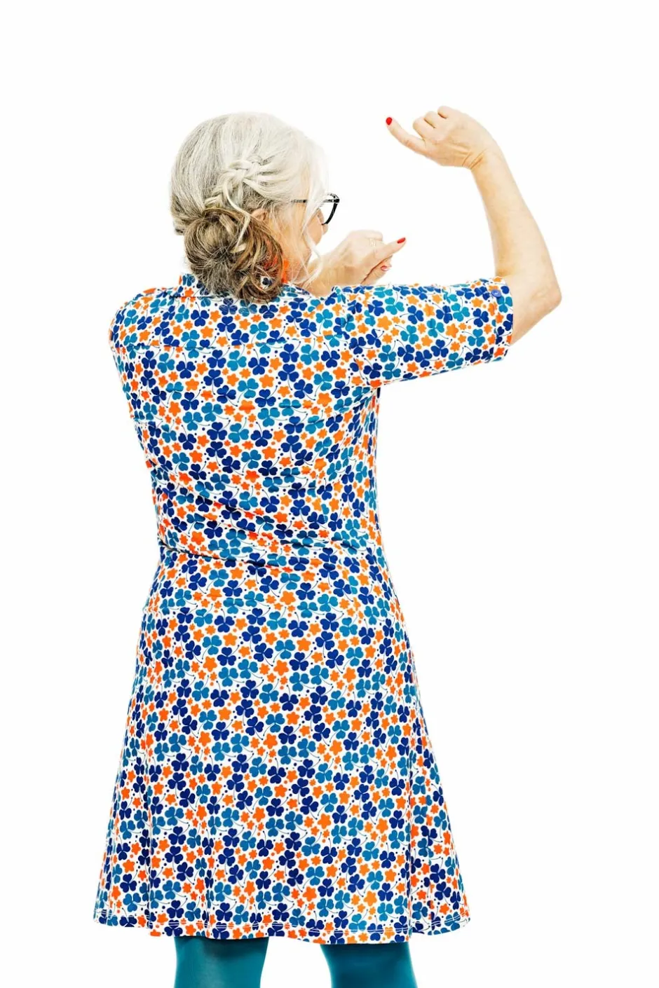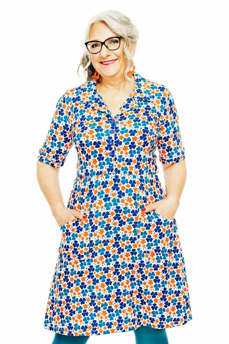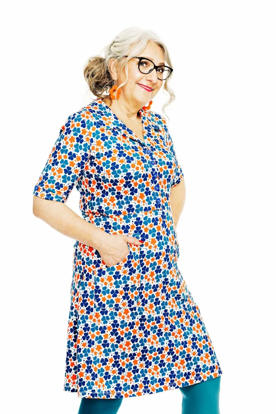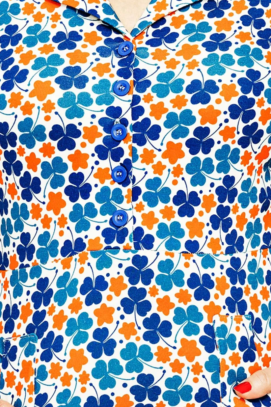 Tyget heter Klöver Orange och är ett retroinspirerat mönster med en tydlig blinkning till 1970-talet. Den stiliserade klövern och blomman skapar en lekfull harmoni i klara färger. Mönstret går i nyanser av orange, petrol och blått mot en krämvit botten – en färgstark och nostalgisk design med en tidlös känsla.