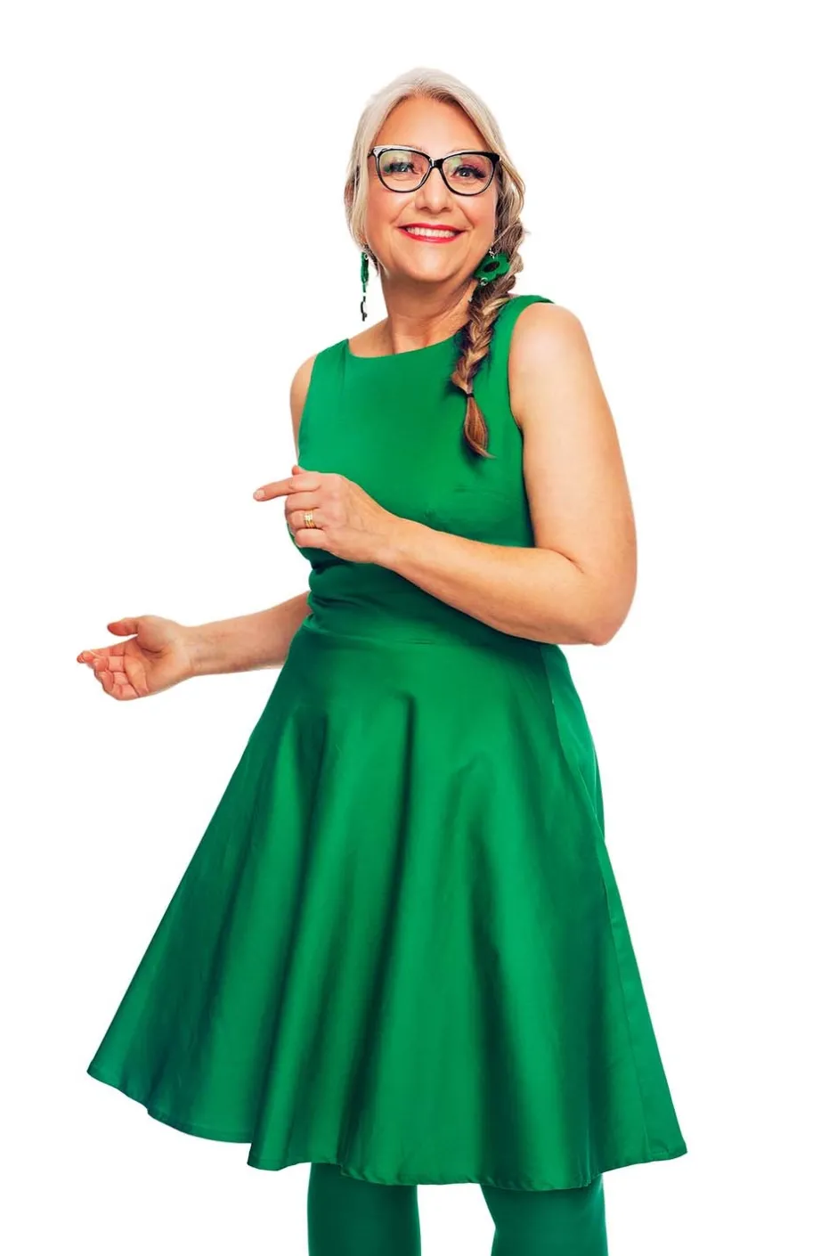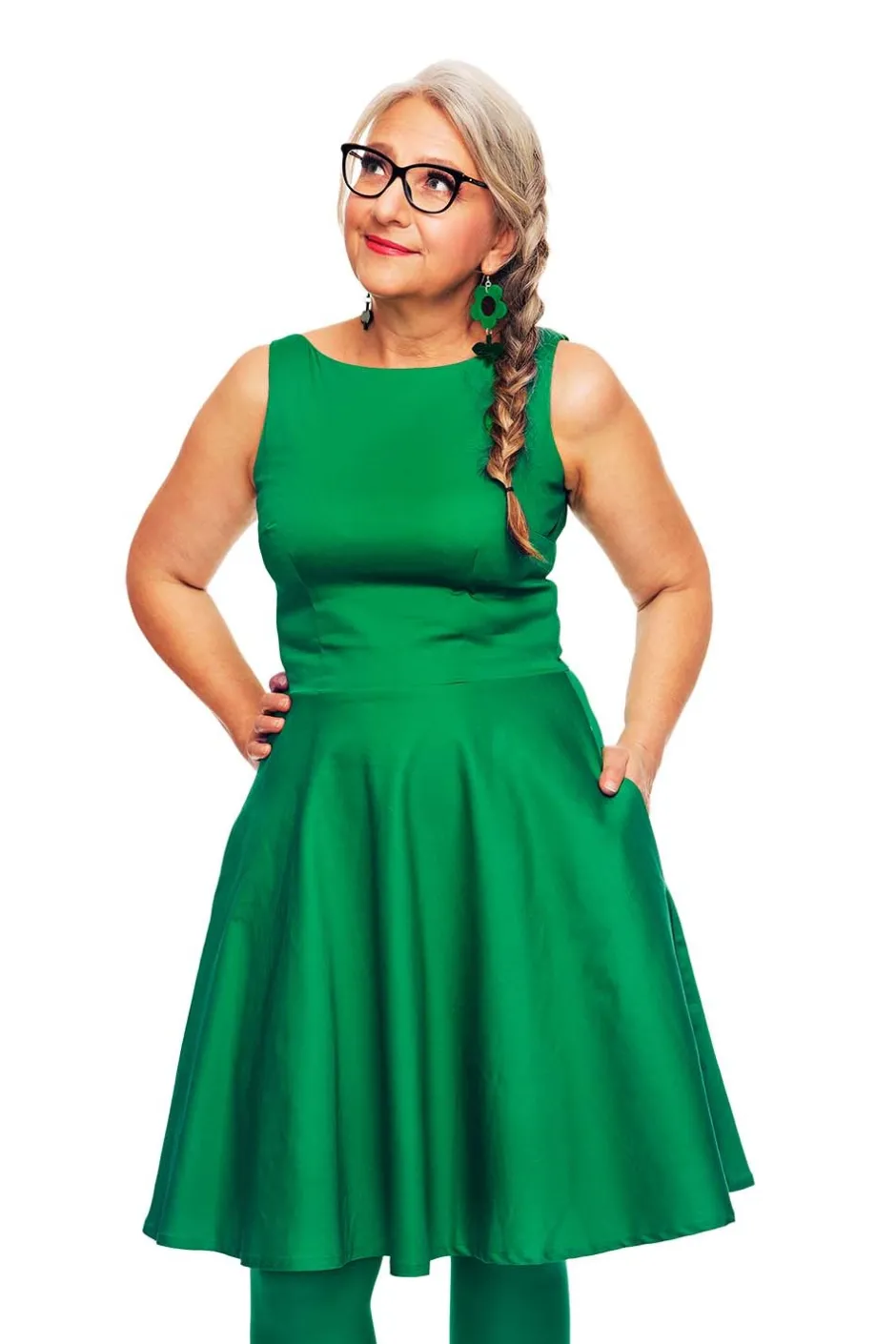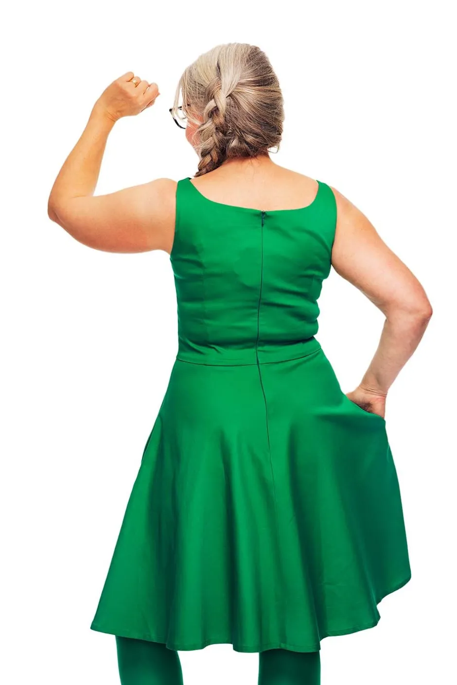 Saga är en festlig 50-tals modell med mycket vidd i kjolen. Klänningen är ärmlös, har båtringning, dolda fickor i sidan samt en osynlig dragkedja mitt bak. Kjolen är fodrad för att få ett läckert fall och för att inte haka upp sig på dina strumpbyxor.