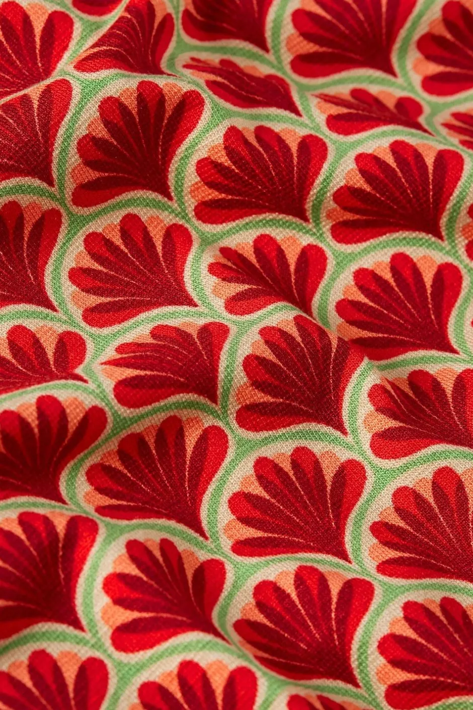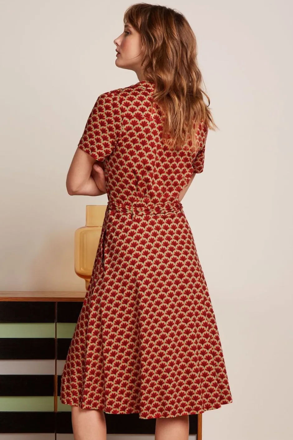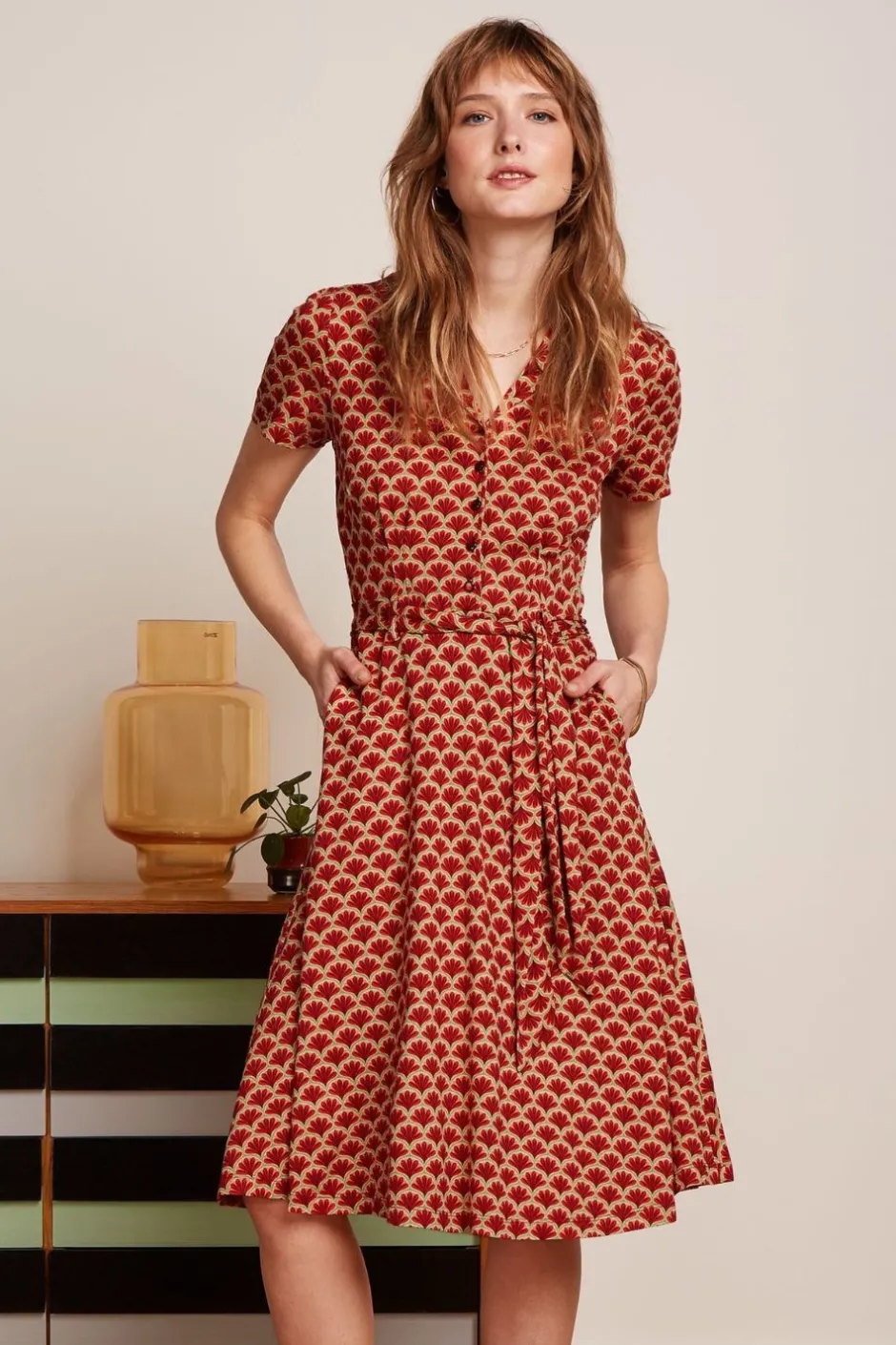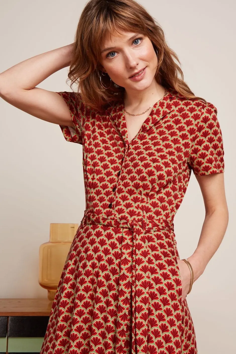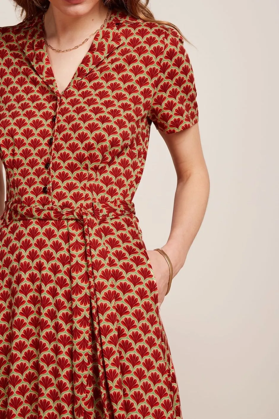 Klänningen har grafiskt mönster i färgerna rött, grönt och beiget.