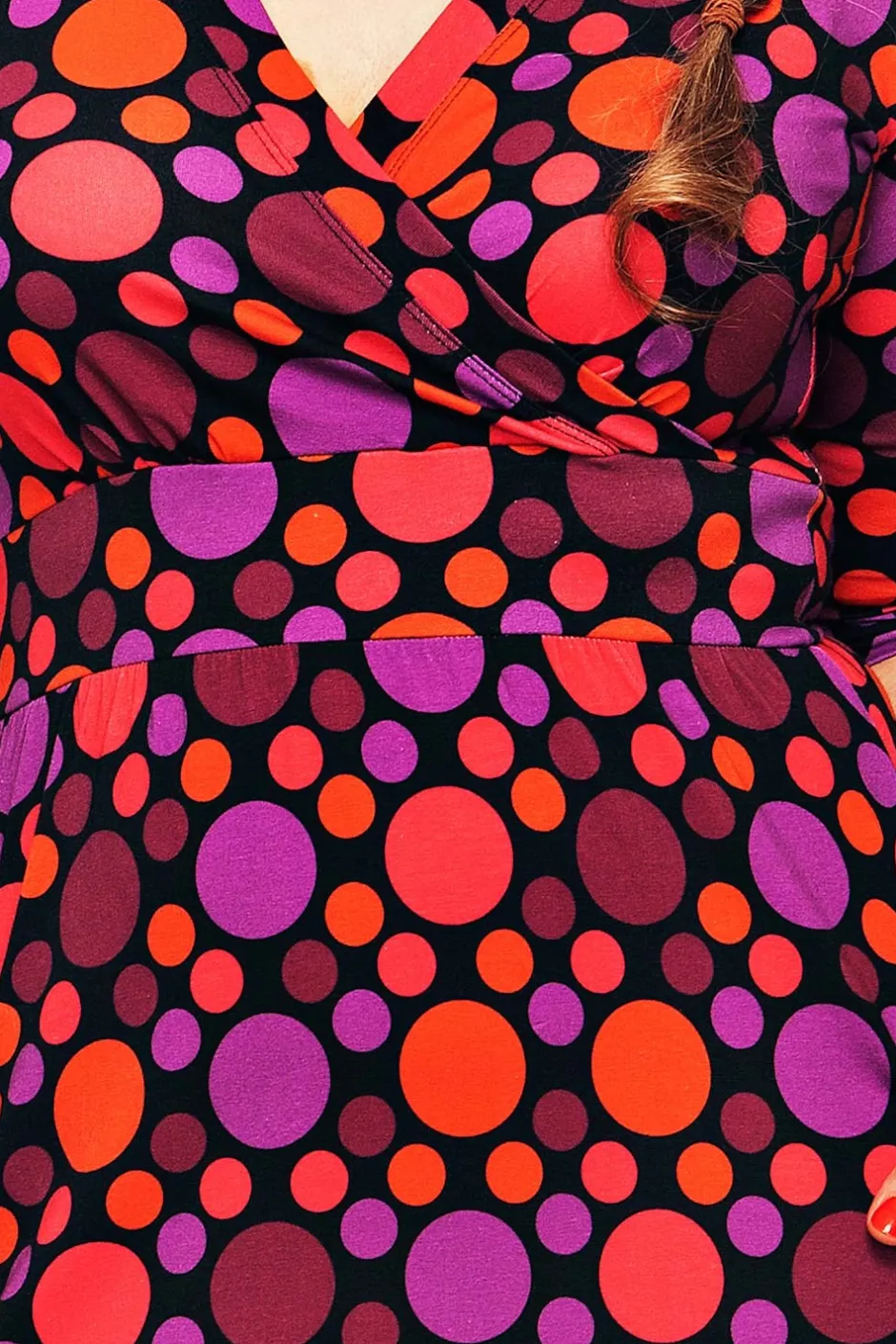 Tyget heter Tidpunkt Plommon och är ett storprickigt tyg på en svart botten med prickar i olika lila, rosa och orange toner.