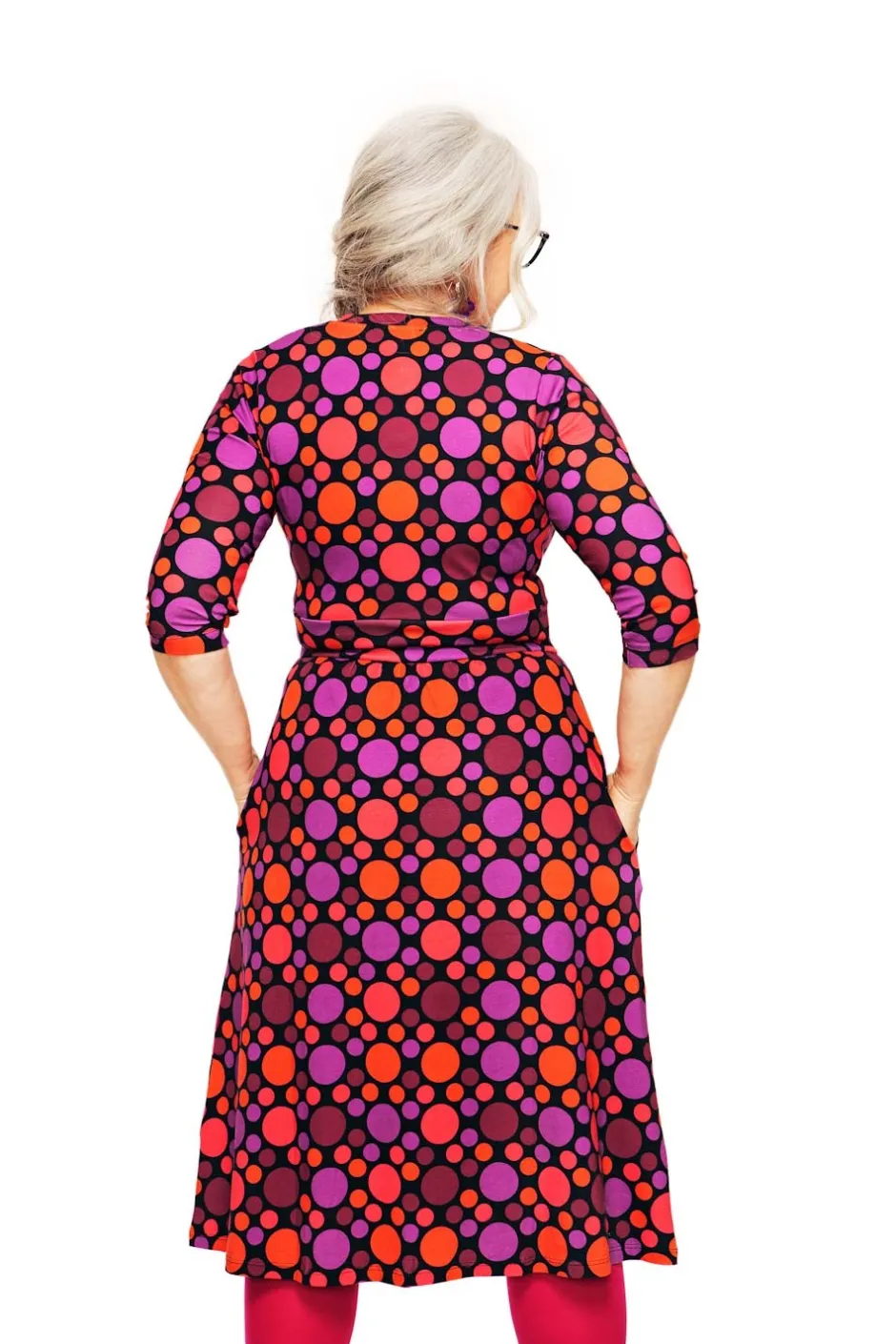 Vera är en välarbetad klänningsmodell i mjuk och skön ekologisk bomullstrikå med fina detaljer. Den har V-formad omlottringning, ett midjeparti och lätt rynkad kjol med fickor i sidorna. Längden är till knät och ärmen går till armbågen.