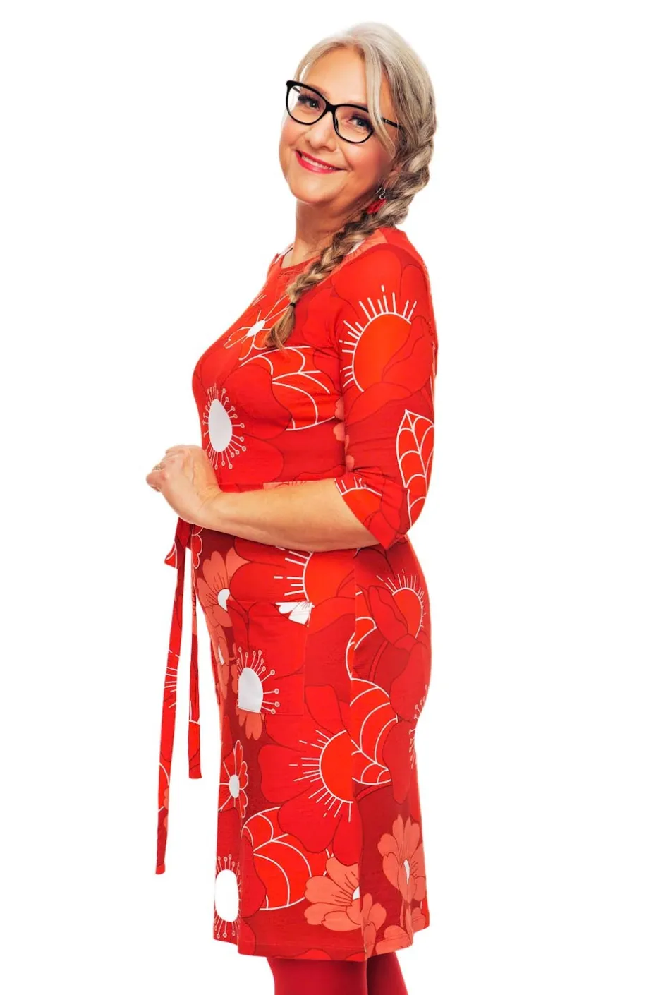Doris är en A-formad trikåklänning med inspiration från 60-talet. Modellen är nättare upptill med lösare passform nedtill, har trekvartsärm och påsydda fickor fram. Tillhörande band kan knytas i midjan.