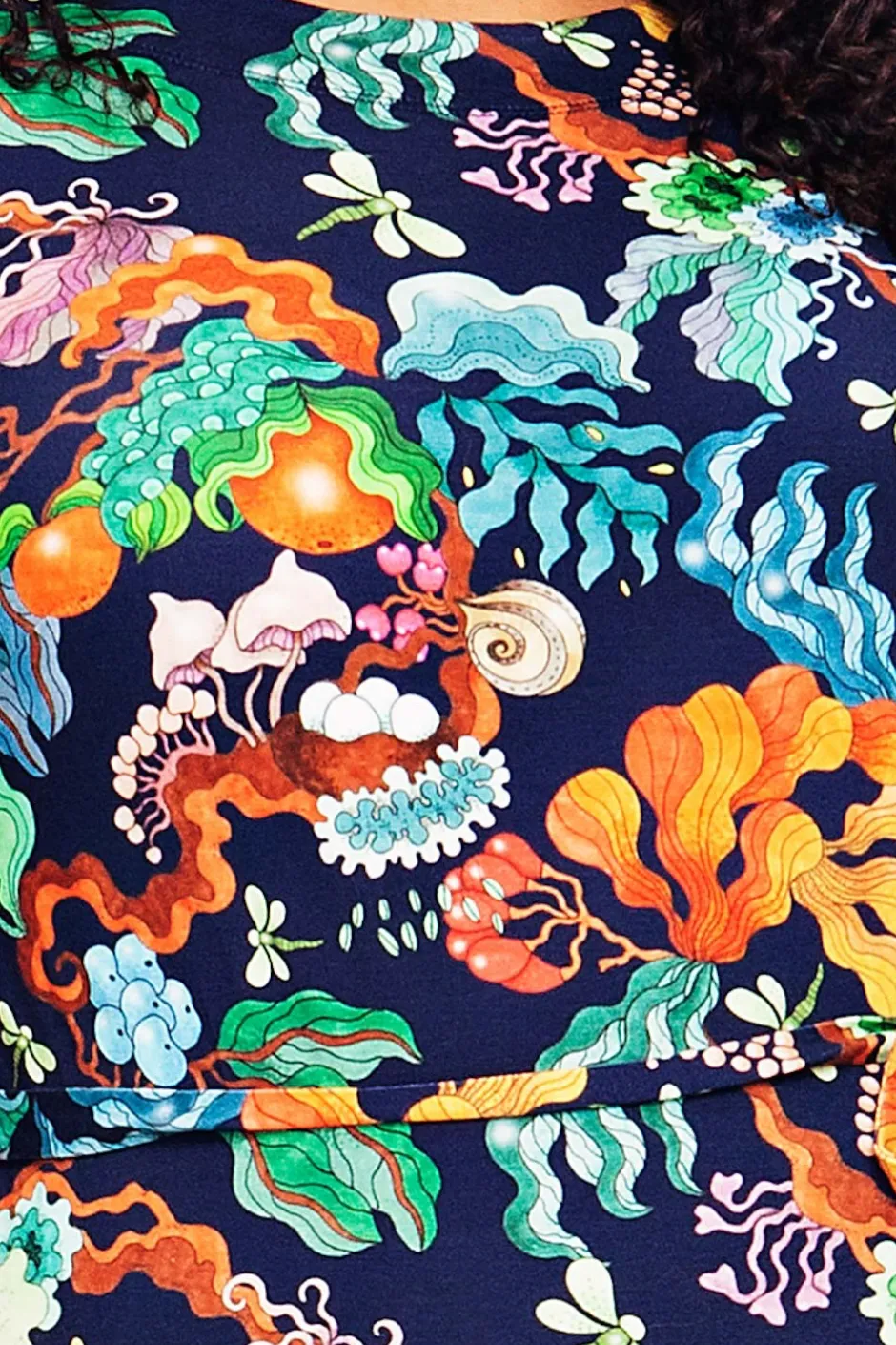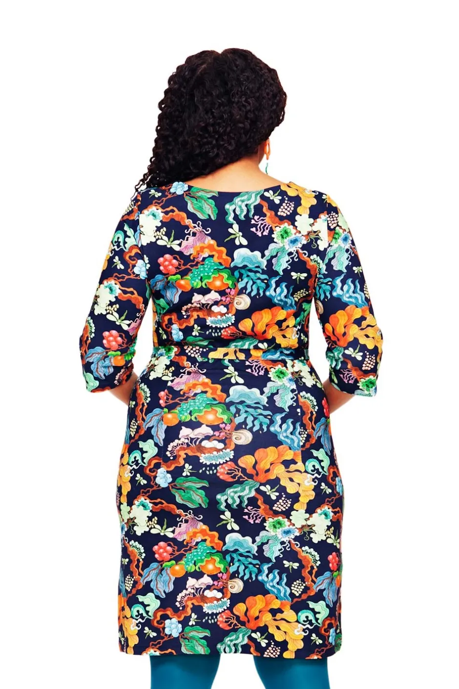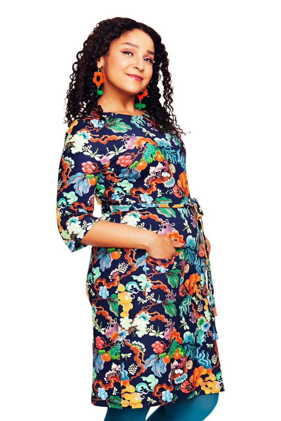Doris är en A-formad trikåklänning med inspiration från 60-talet. Modellen är nättare upptill med lösare passform nedtill, har trekvartsärm och påsydda fickor fram. Tillhörande band kan knytas i midjan.