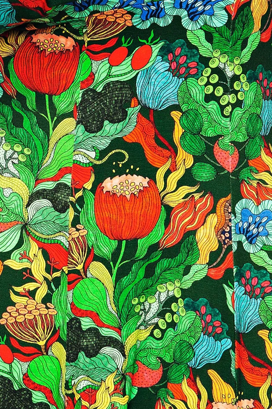 Tyget heter Babylon grön, ett organiskt böljande mönster i täta slingor med blad och blommor, här och var dyker också några nypon upp. Färgerna skiftar i många olika färger bl.a grön, blå, rosa, gul orange, röd och turkos. Mönstret är designat av Framiadesign.