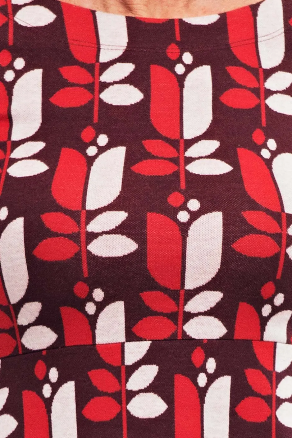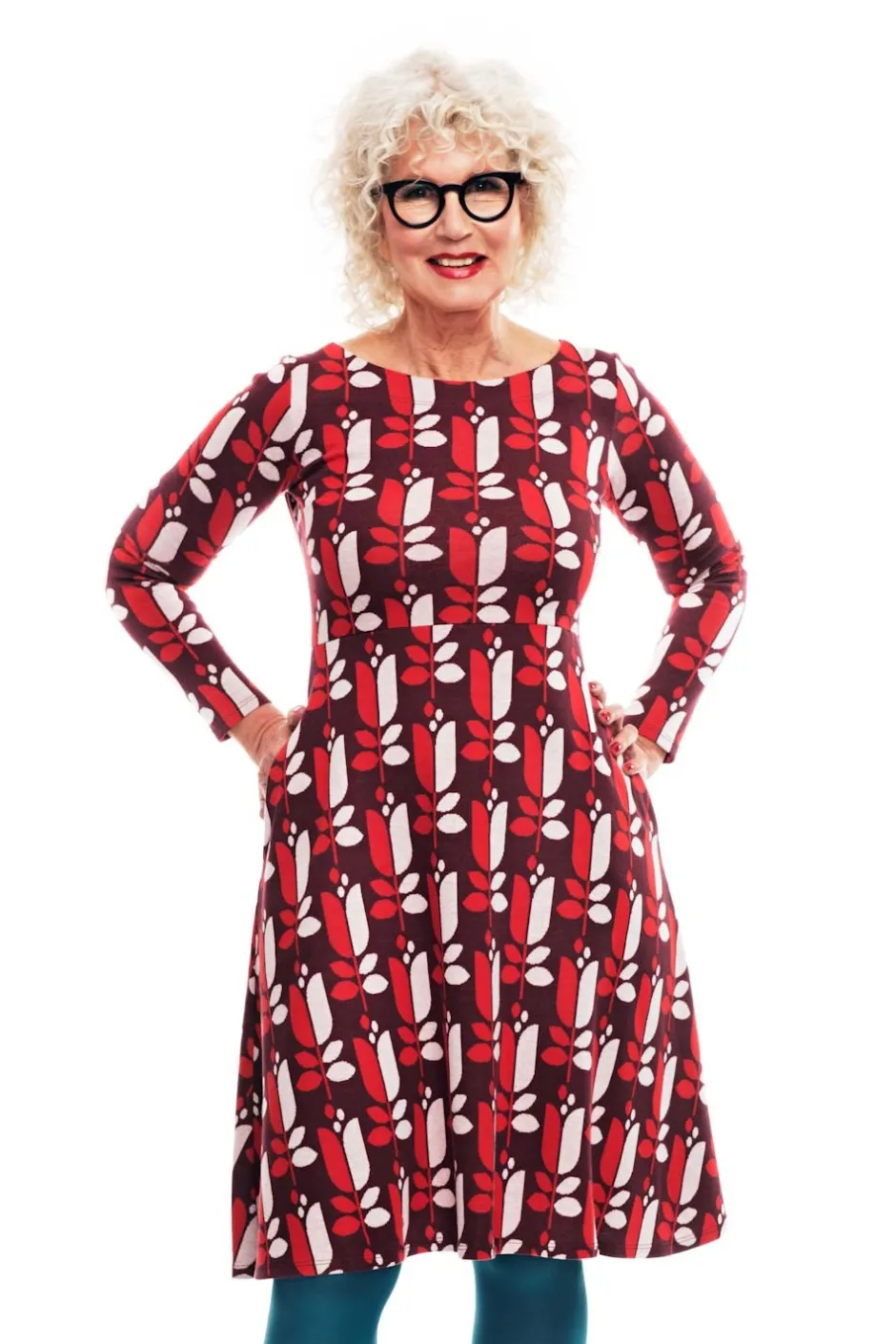 Långärmad klänning med figurnära liv och vid kjol. Båtringad, längd till strax nedanför knät och självklart fickor i sidan. Tyget heter Klang och har en vinröd bakgrund med blommor i röd och vit. Obs! Tyget är tjockare än vår vanliga trikå. Det drar ihop sig lite efter tvätt, framför allt på längden.
