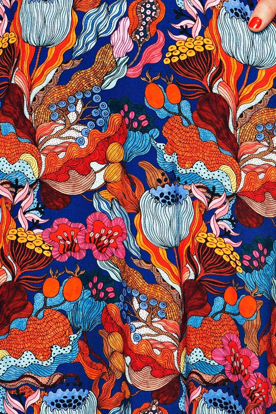 Tyget heter Babylon blå, ett organiskt böljande mönster i täta slingor med blad och blommor, här och var dyker också några nypon upp. Färgerna skiftar i många olika färger bl.a mörkblå, ljusblå, rosa, brun, orange, röd och turkos. Mönstret är designat av Framiadesign.