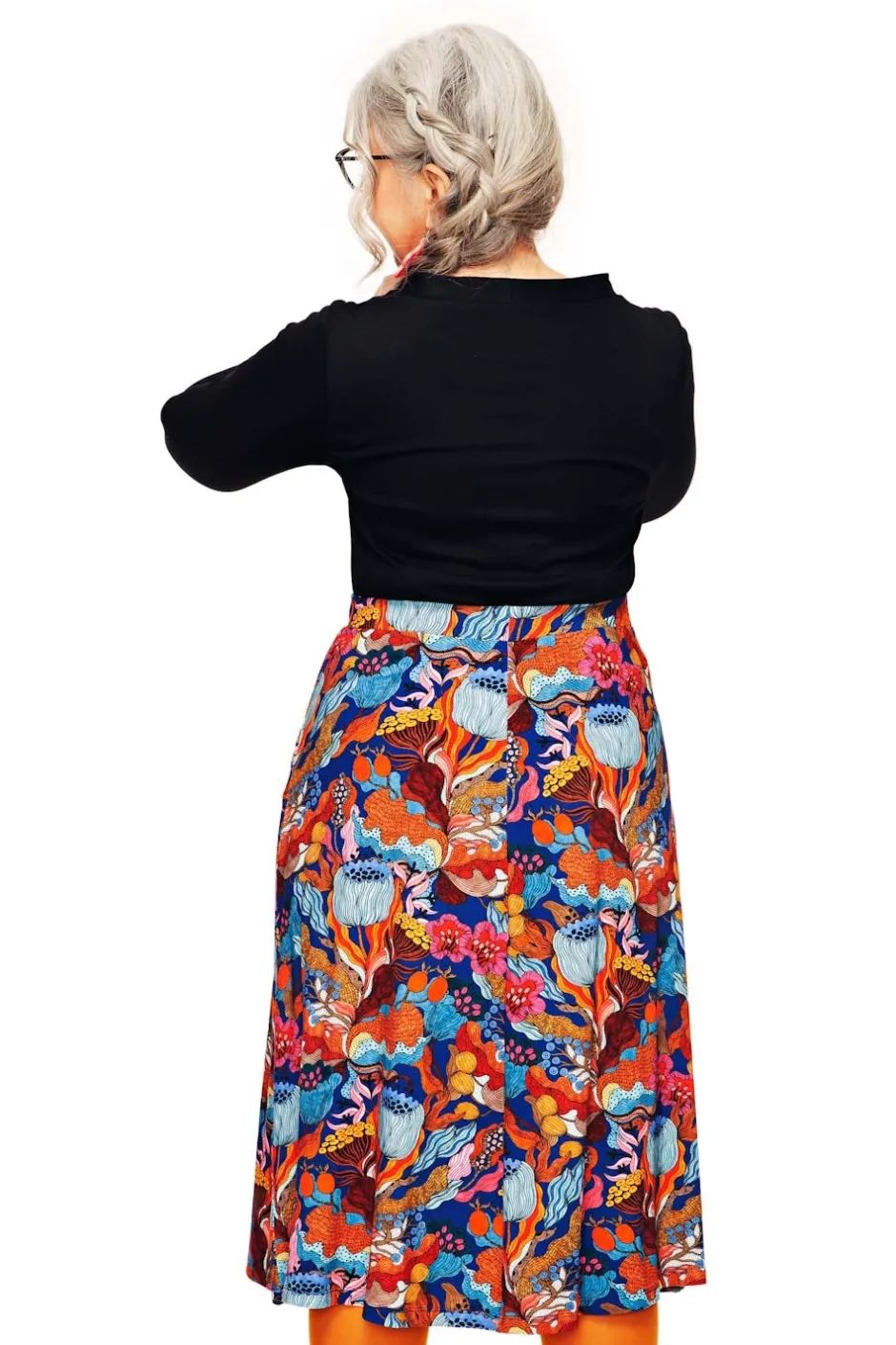 Lisa är en mjuk kjol i stretchig viskostrikå. Kjolen har fickor, resår i midjan och längden är till strax under knät. En lätt utställd passform gör att den är både elegant och bekväm.