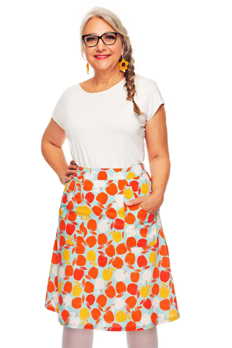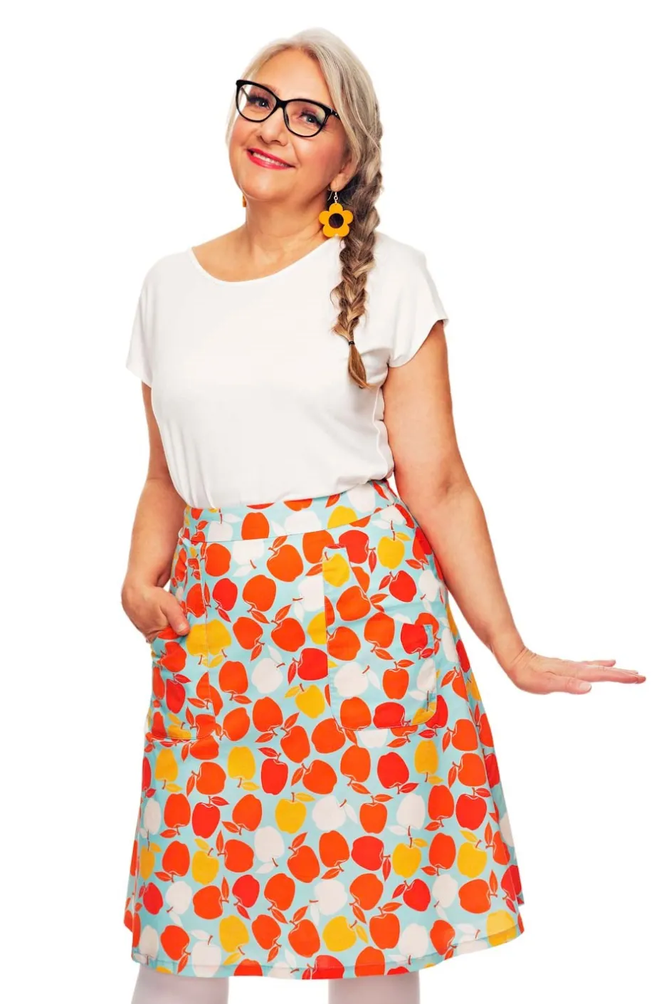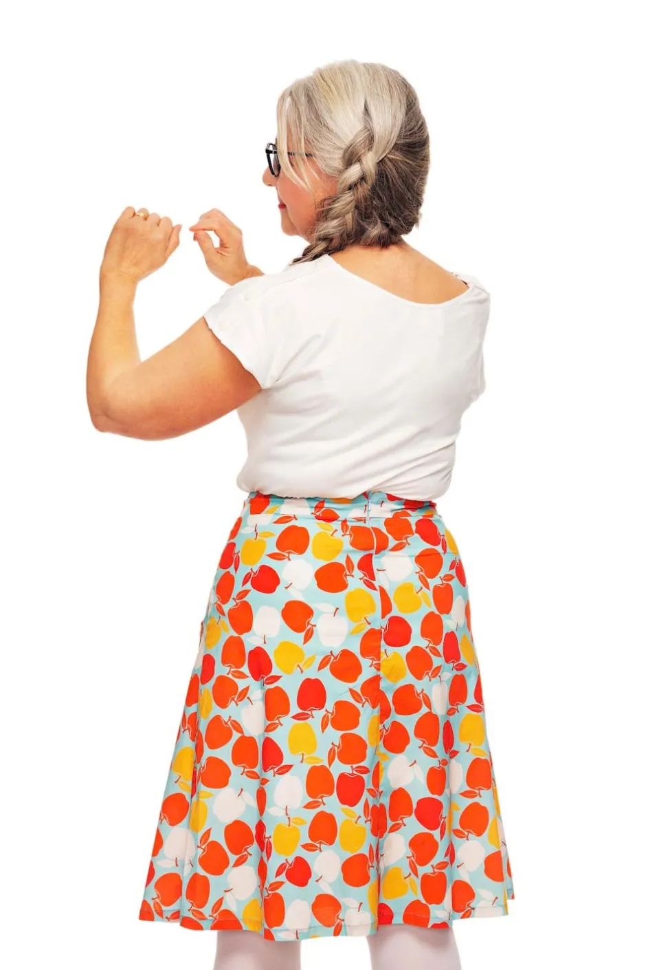 Sonja är en utställd kjol från Cissi och Selma. Kjolen har linning upptill samt stora synliga fickor fram. Kjolen är fodrad så att den inte hänger upp sig på strumpbyxorna och är lätt att komma i och ur med dragkedja bak.