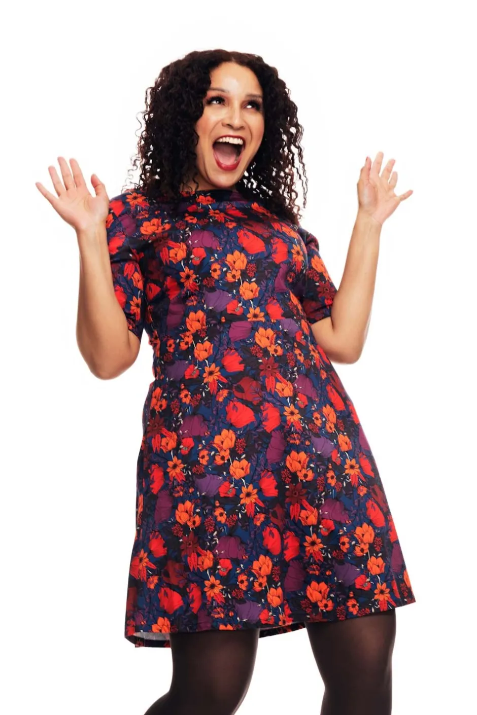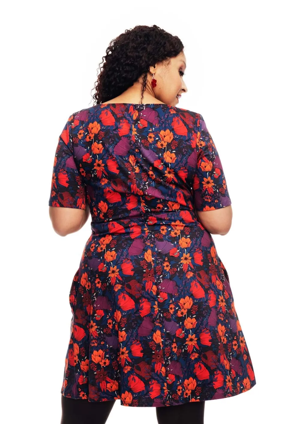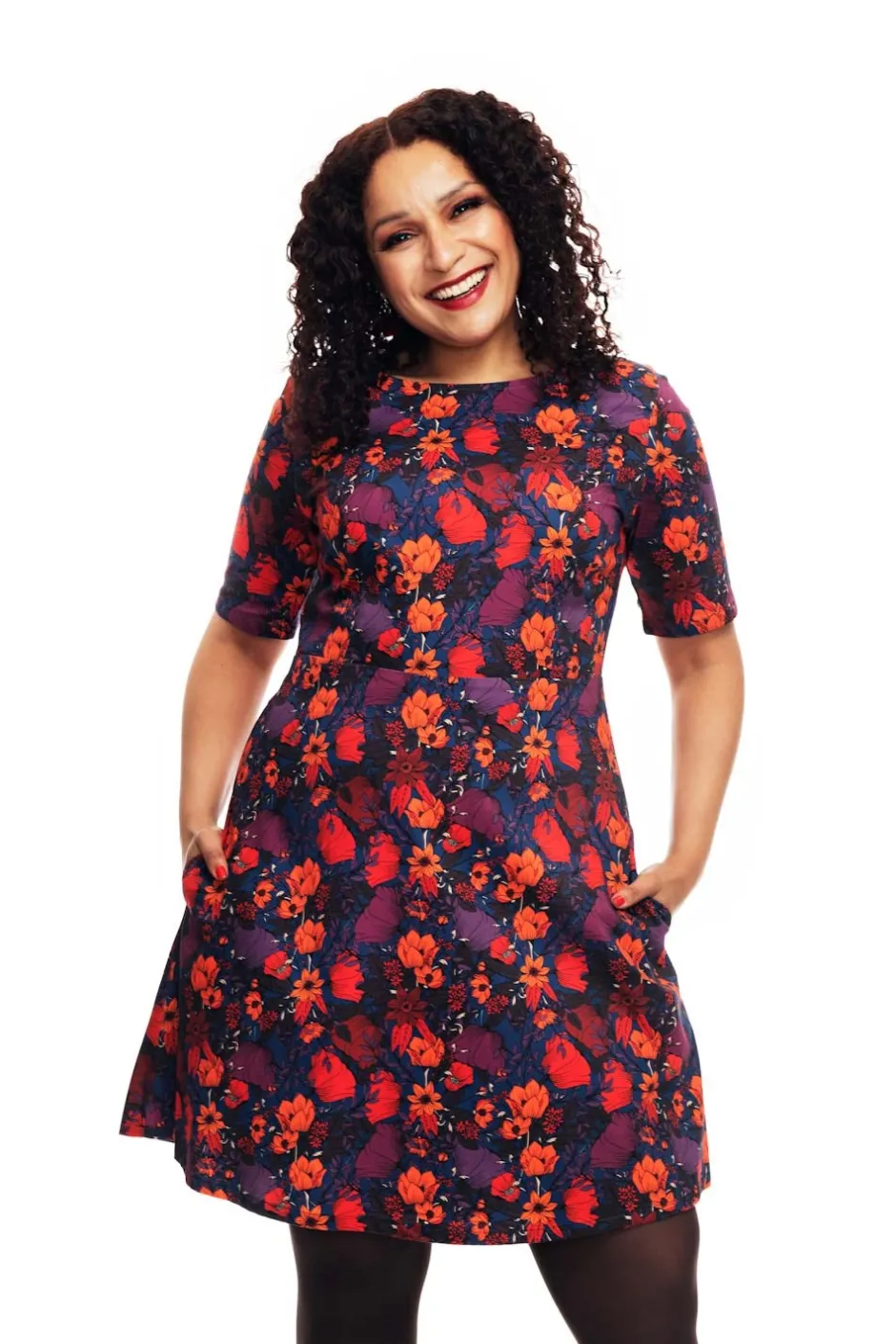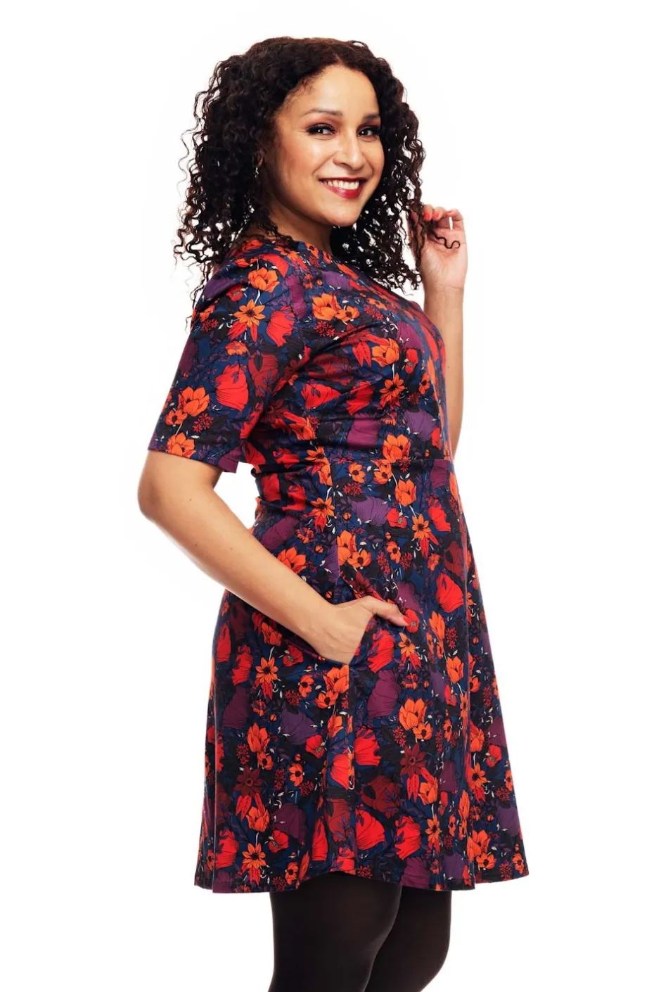 Irma är en klassisk klänningsmodell inspirerad av 50-talet med en båtringning, lite högre skärning i midjan och utställd kjol. Den har ärmar som slutar ovanför armbågen, dolda fickor i sidan och har foder i kjolen. Klänningen är lätt att komma i tack vare dragkedjan i ryggen. Tyget är lite stretchigt vilket gör klänningen skön att ha på sig. Bär den till vardags eller var snyggast på festen!