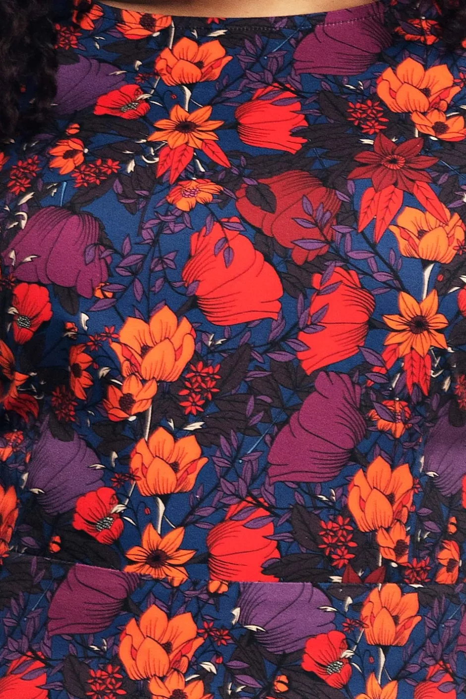 Tyget heter Ackord och har en blå bakgrund med blommor och blad i lila, orange, röd och brun.