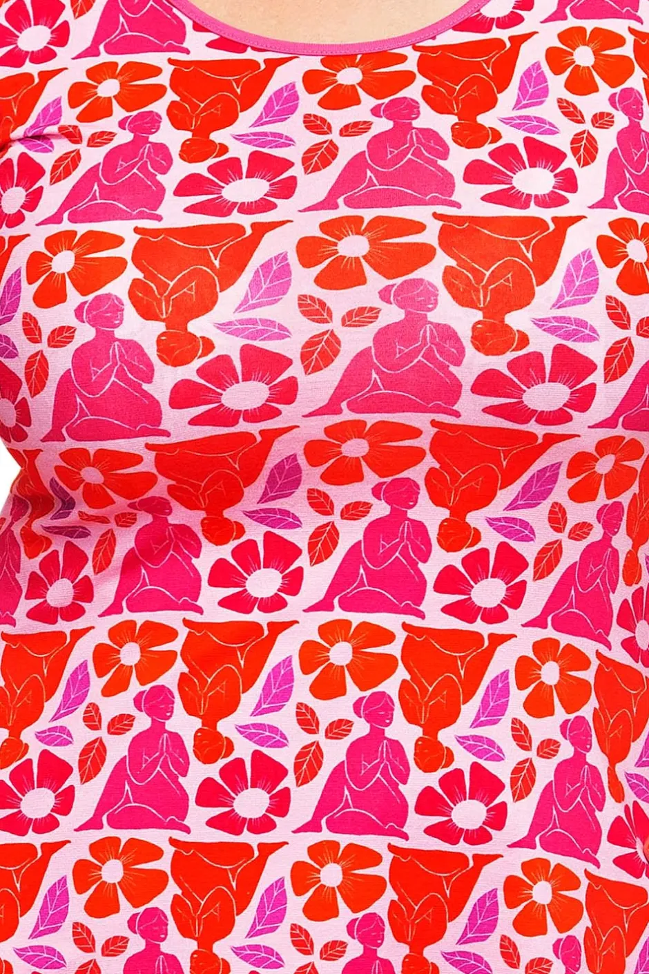 Tyget heter Fridfull Rosa och har en rosa bakgrund med yogakvinnor och blommor i röda och rosa nyanser. Mönstret är designat av Frida Hammar.