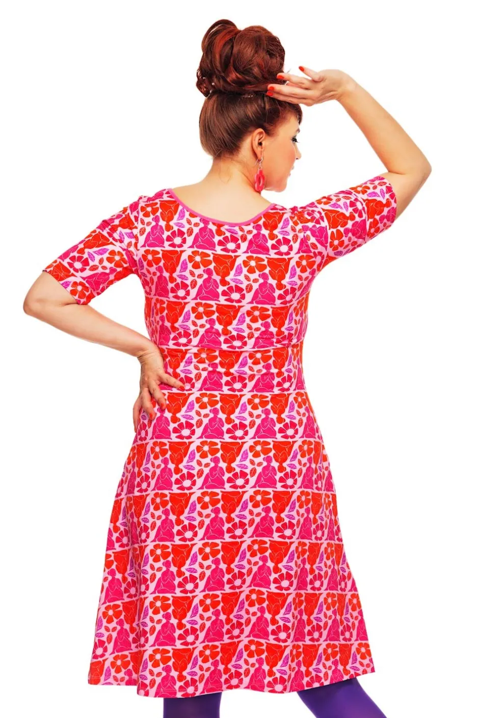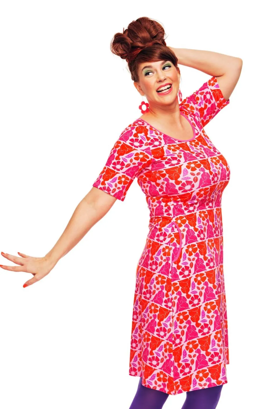 Magda är en trikåklänning utan skärningar med lite vidd i kjolen och perfekt ärmlängd. Klänningen har en elegant halsringning och fickor i sidorna med kontrasterande kantband.
