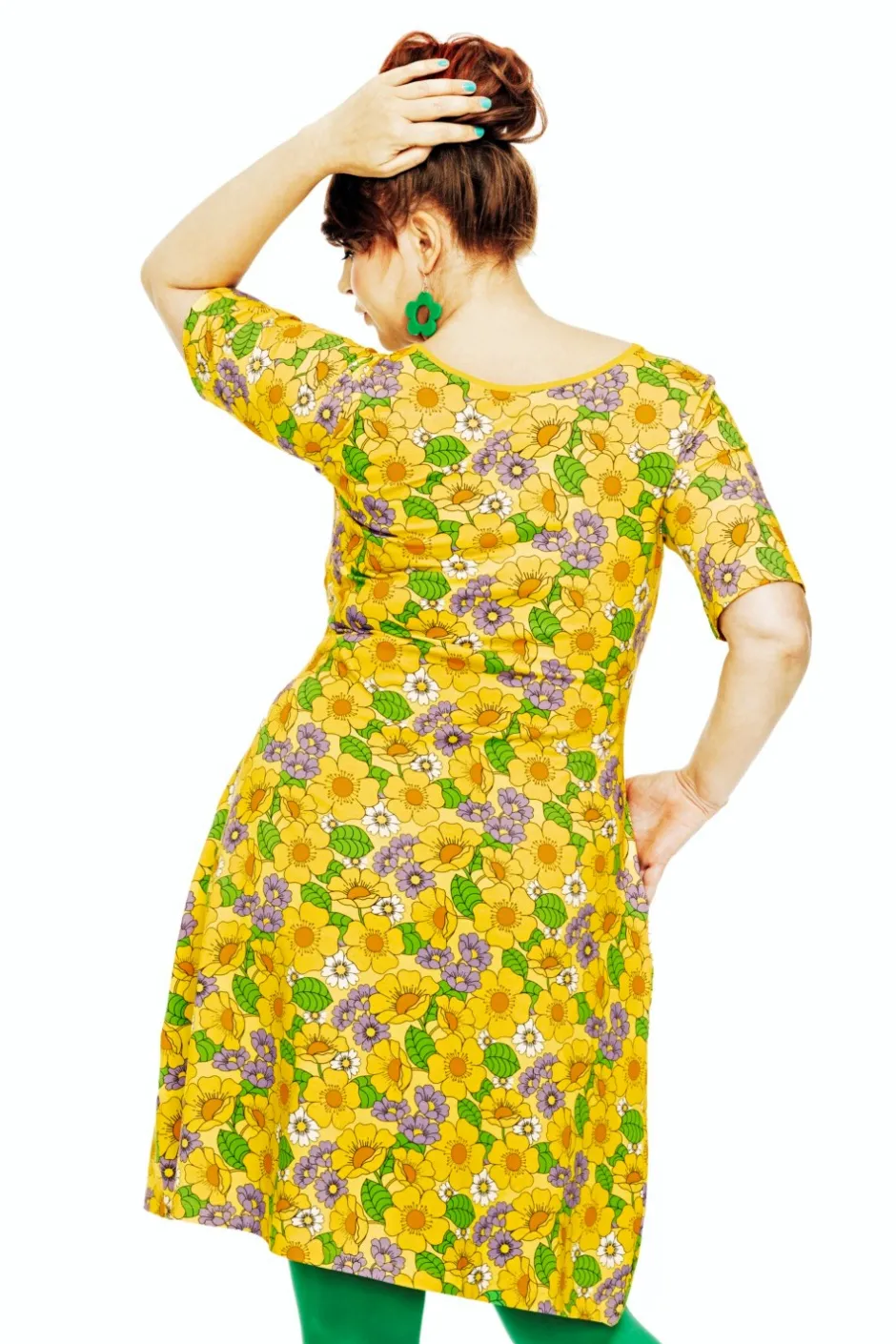 Tyget heter Humlesurr gul. Det här är Cissi och Selmas klassiska blommönster som återkommer varje säsong i olika färgställningar, som denna variant där gult och lila dominerar. Ett blommönster i underbar färgprakt i solgult, grönt och lila.