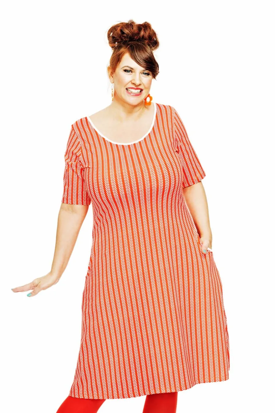 Magda är en trikåklänning utan skärningar med lite vidd i kjolen och perfekt ärmlängd. Klänningen har en elegant halsringning och fickor i sidorna med kontrasterande kantband.