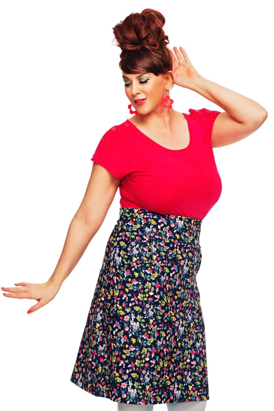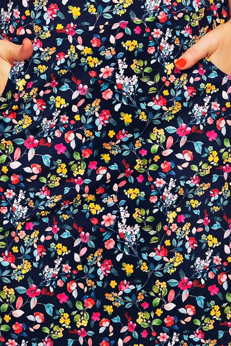 Majken är en bekväm trikåkjol med figurnära passform. Kjolen har fickor och bred mudd i midjan. Längden är till strax ovanför knät. Blommigt mönster på mörkblå botten.