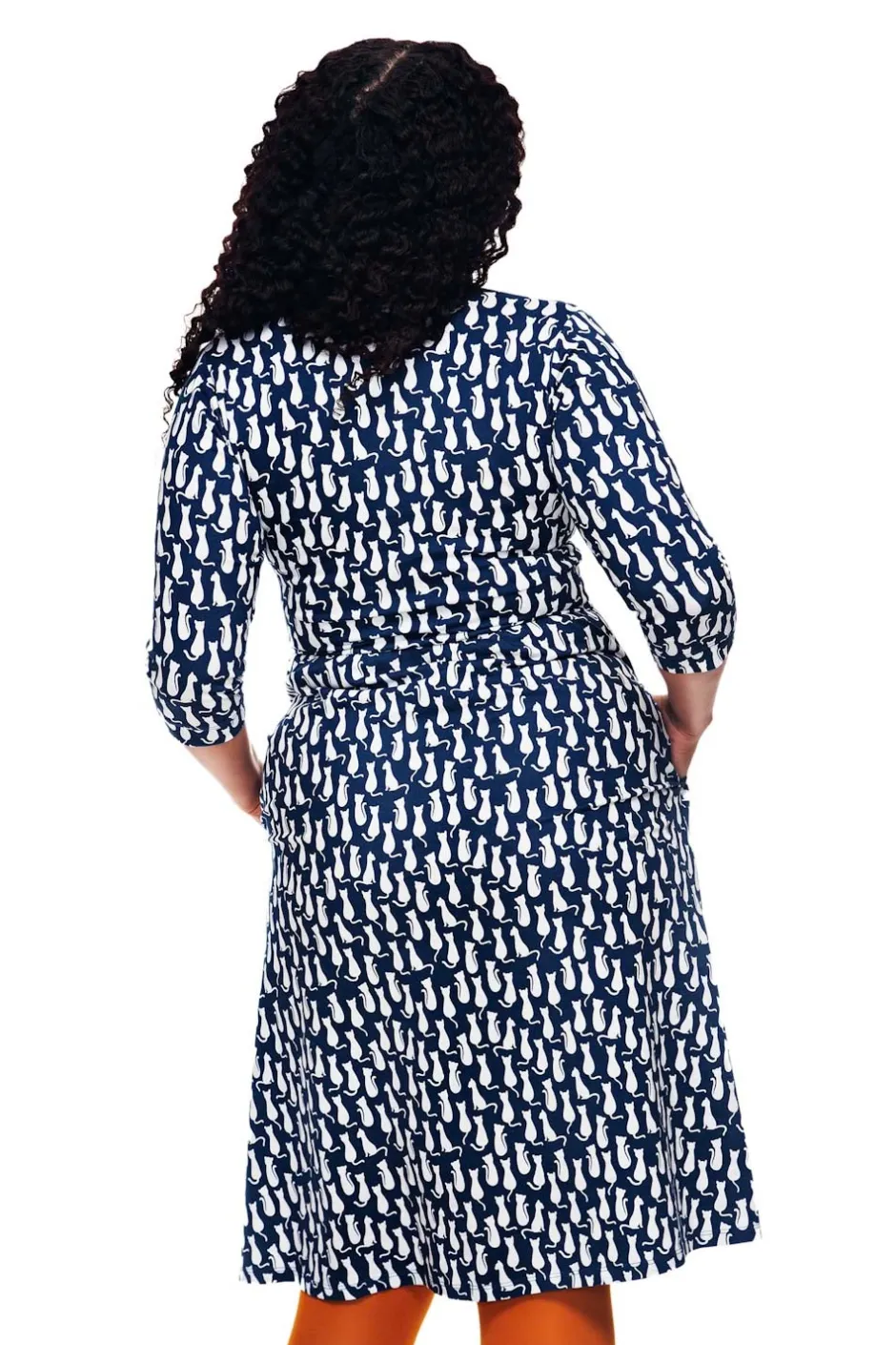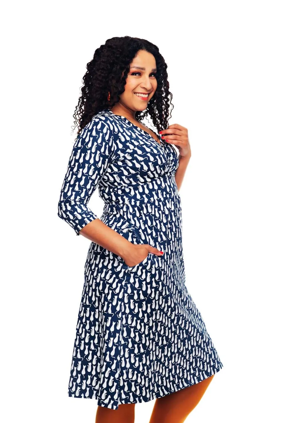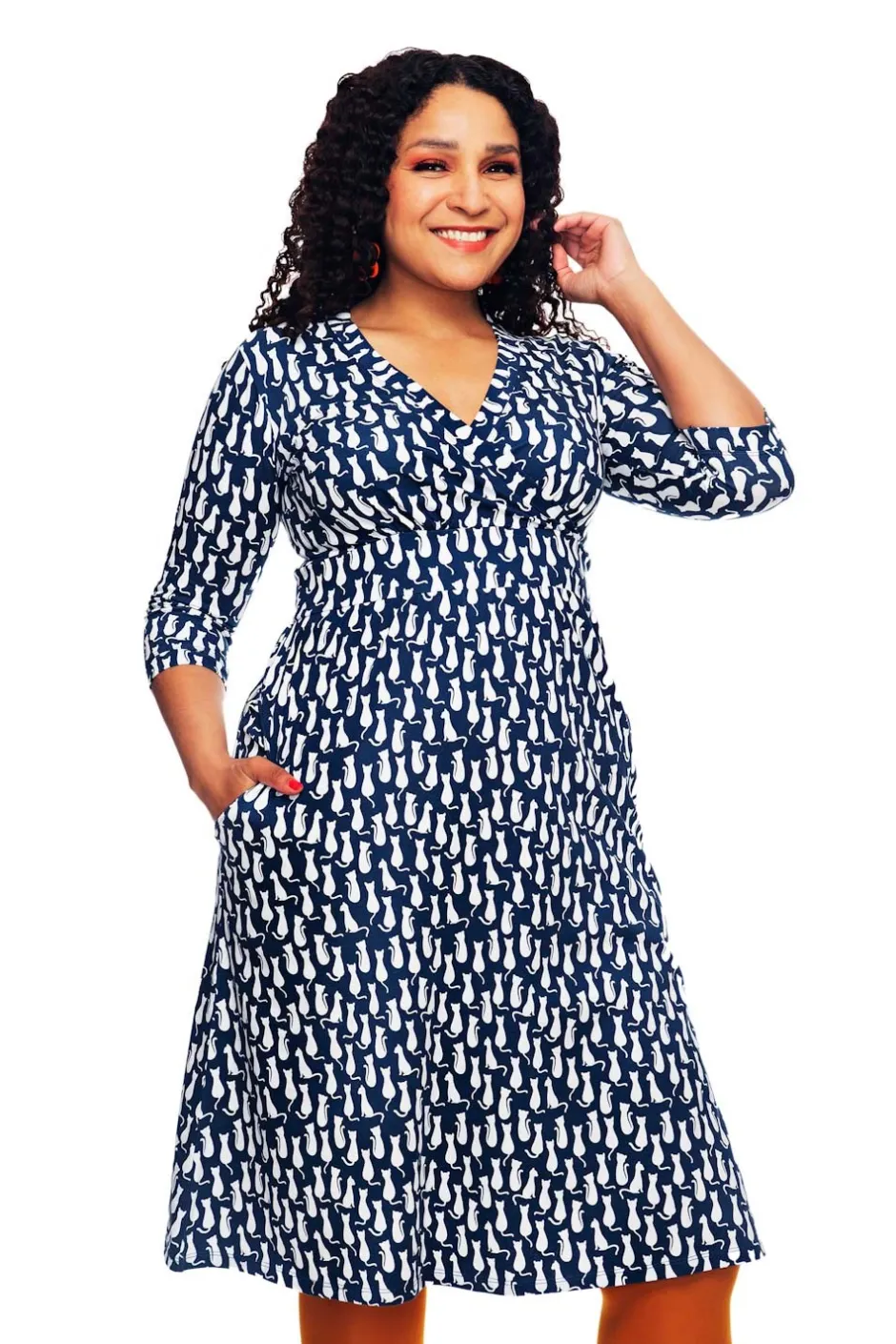 Vera är en välarbetad klänningsmodell med fina detaljer. Den har V-formad omlottringning, ett midjeparti och lätt rynkad kjol med fickor i sidorna. Längden är till knät och ärmen går till armbågen.