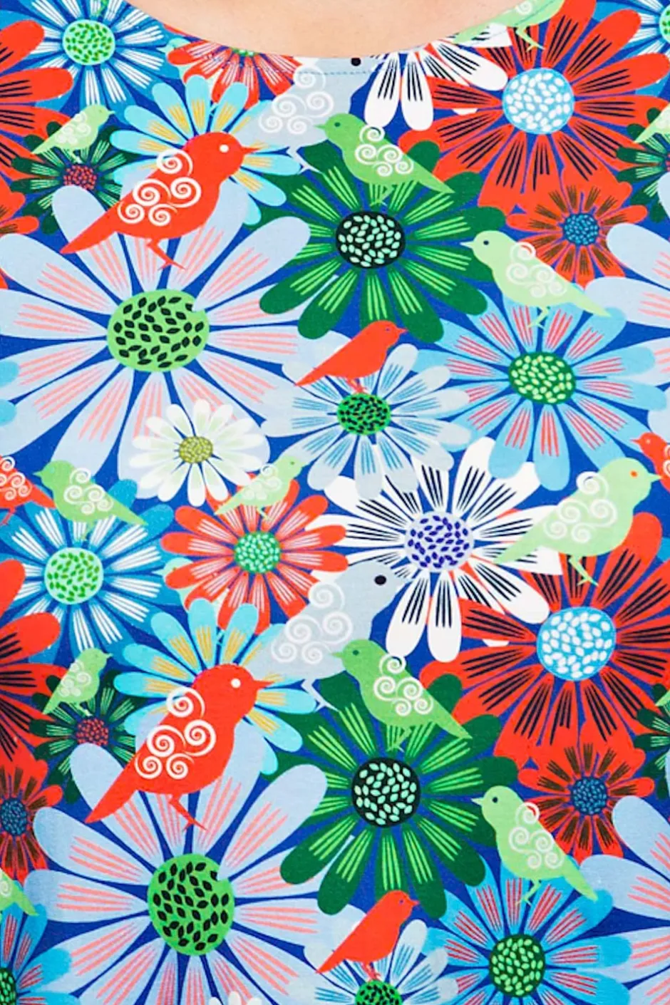 Tyget heter Fågeltivoli Blå och har en ljusblå botten med ett blommönster i grönt, vitt, rött och blått med små fåglar.