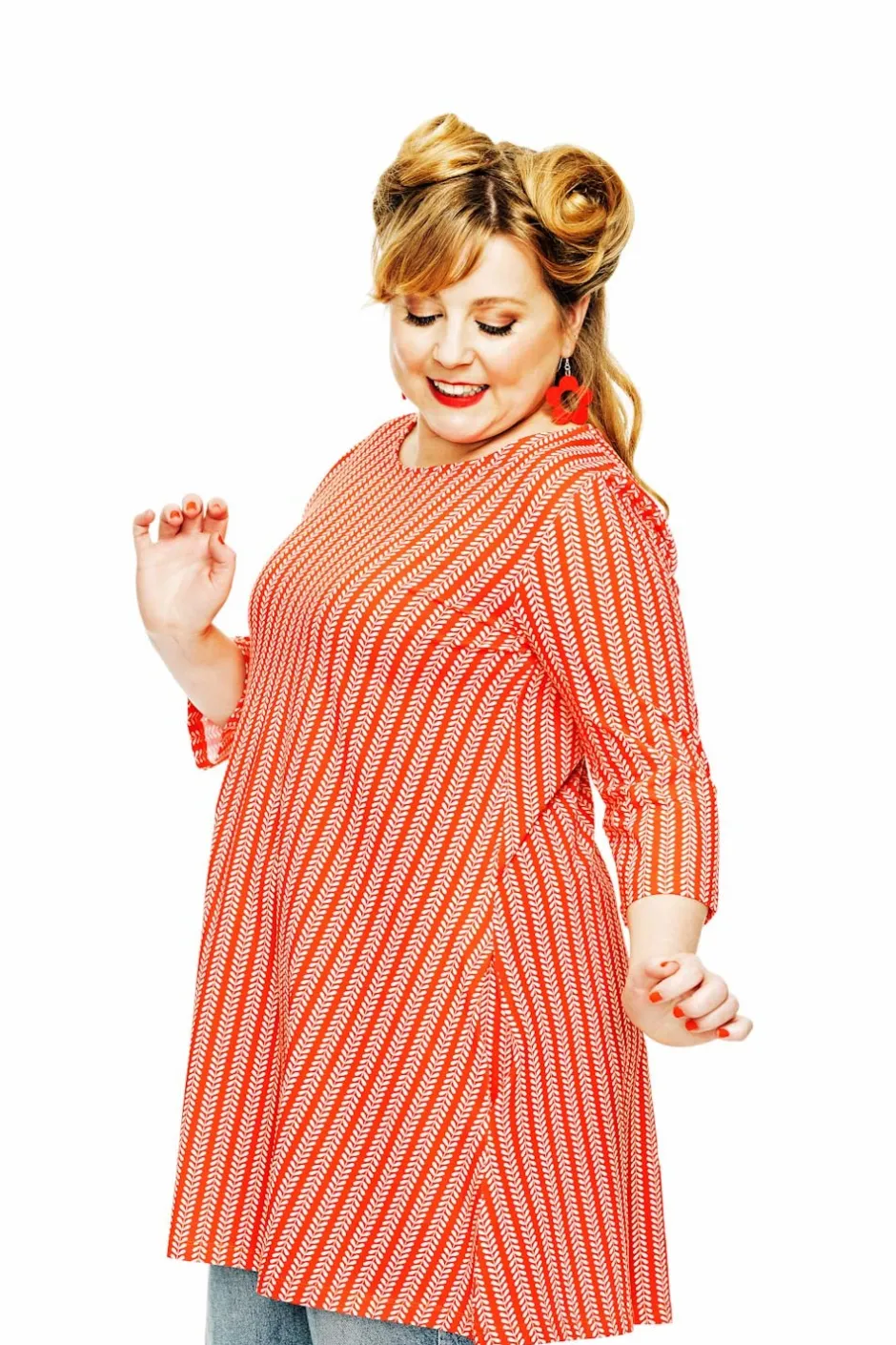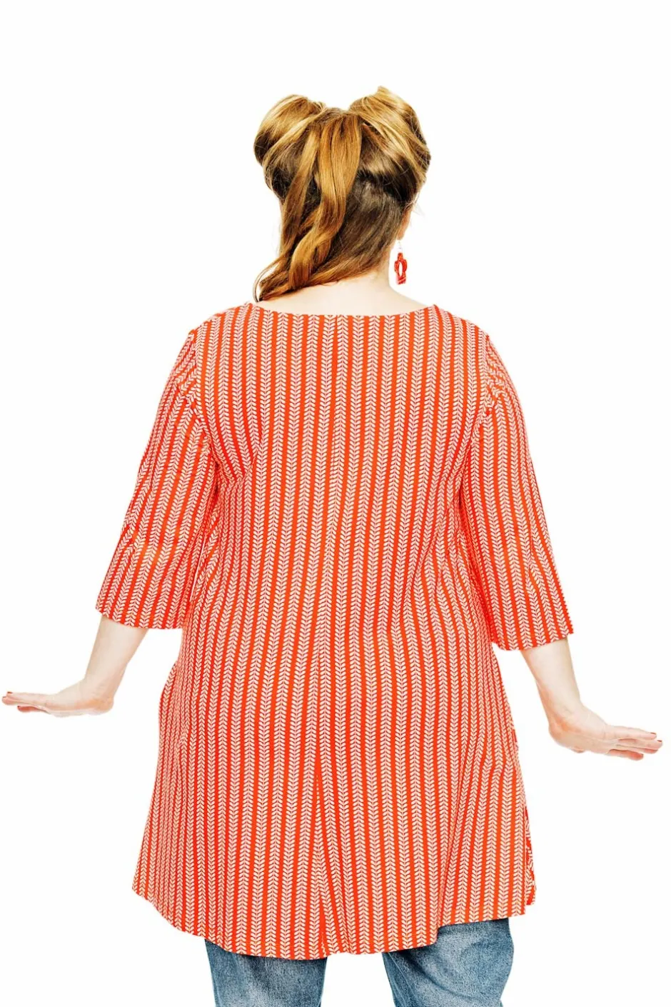 Anita är vår tunika i ekologisk bomullstrikå, perfekt för dig som vill ha en lite längre topp att bära över byxor. Självklart med fickor i sidan!