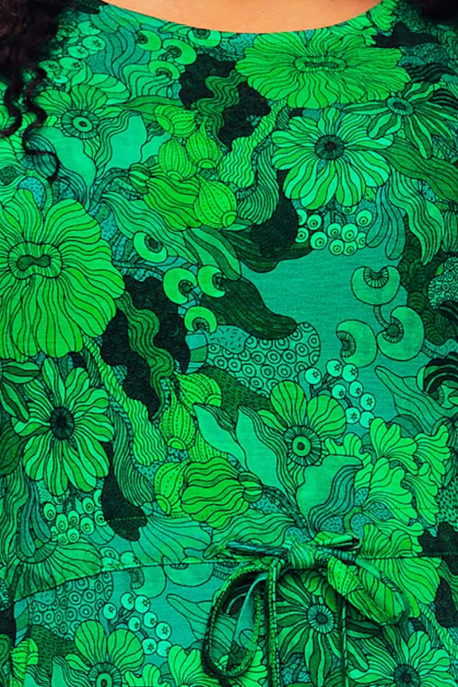 Tyget heter Illusion Grön och har en grön bakgrund med blommor i olika nyanser av grön. Mönstret är designat av Framiadesign.