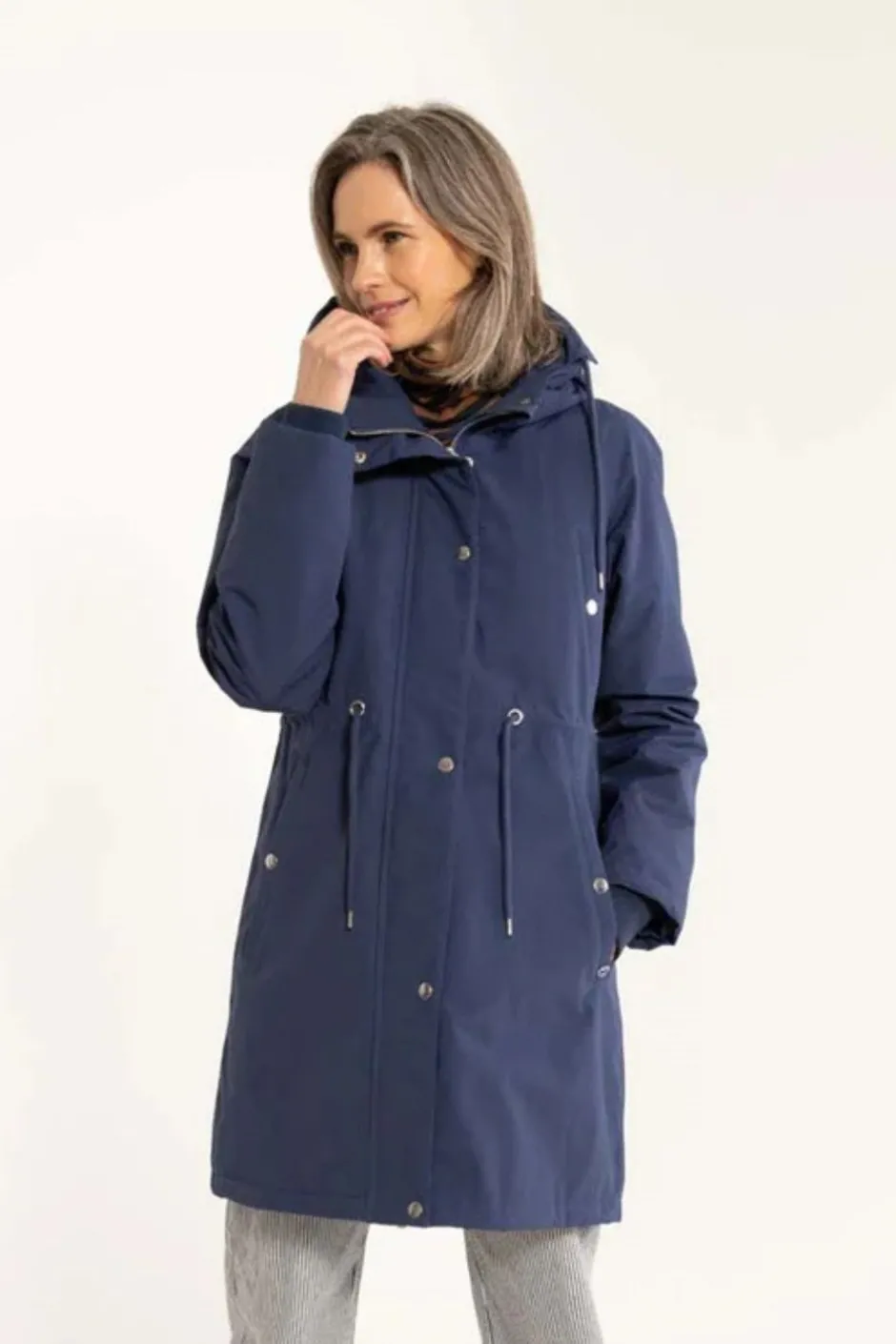 Klassisk regnjacka från det danska kvalitetsmärket Danefæ. Vind- och vattentät parkas med många snygga och praktiska detaljer. Tejpade sömmar. Jackan har dragsko både i huvan samt i midjan och mudd i handlederna. Nora har en elegant design och är lite längre baktill än fram. Två stora fickor i midjan, två mindre på bröstet som stängs med tryckknappar. Jackan har dolt blixtlås, som kan öppnas från båda håll, vilket är väldigt praktiskt för den som rör på sig mycket och t.ex. cyklar. Fluorine-free ytskickt (Bionic Finish).