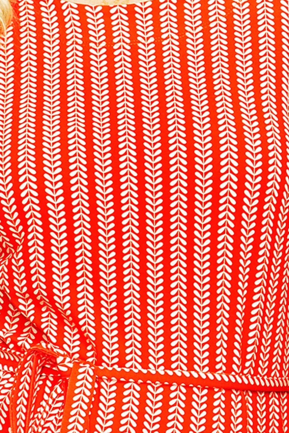 Tyget Ranka är inspirerat av sommarängar och vajande grässtrån. Mönstret har en krämvit design mot en röd/orange botten.