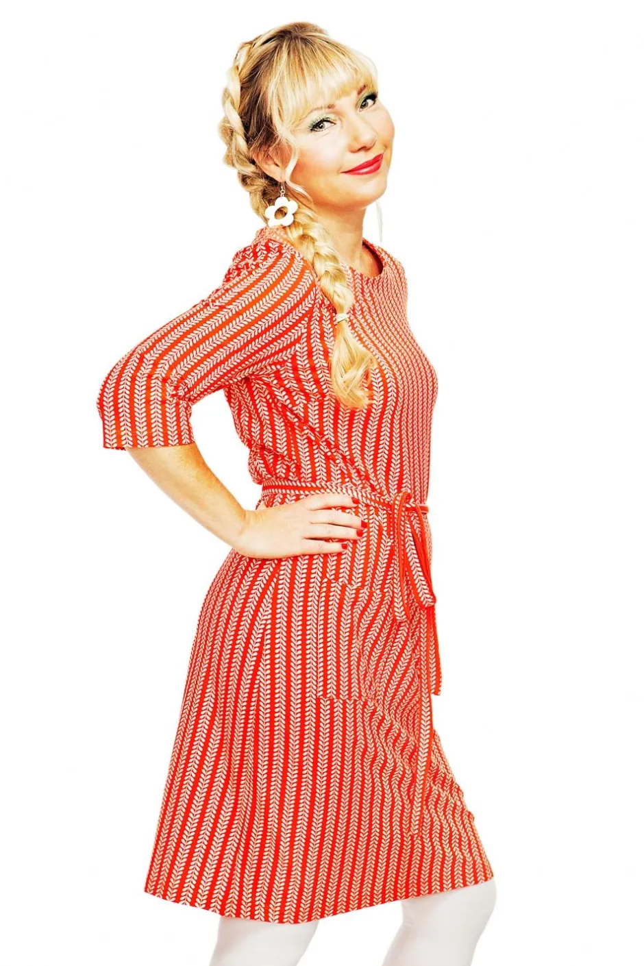 Doris är en A-formad klänning i mjuk ekologisk bomullstrikå med inspiration från 60-talet. Modellen är nättare upptill med lösare passform nedtill, har trekvartsärm och påsydda fickor fram. Tillhörande band kan knytas i midjan.