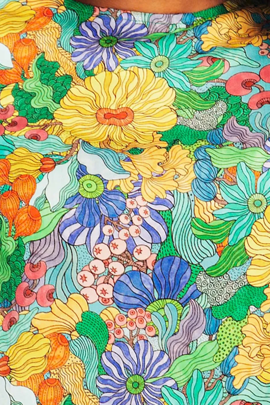 Tyget heter Illusion färgglad och skiftar i många färger bl.a blå, rosa, grön, gul, lila och turkos. Mönstret är designat av Framiadesign.