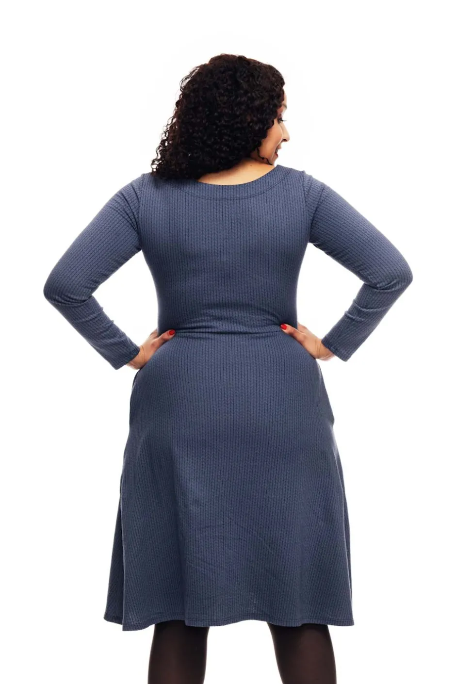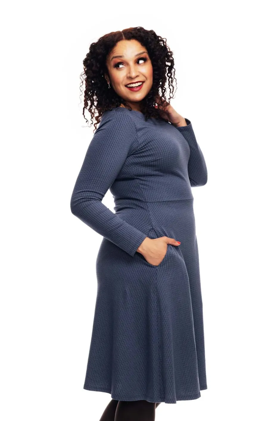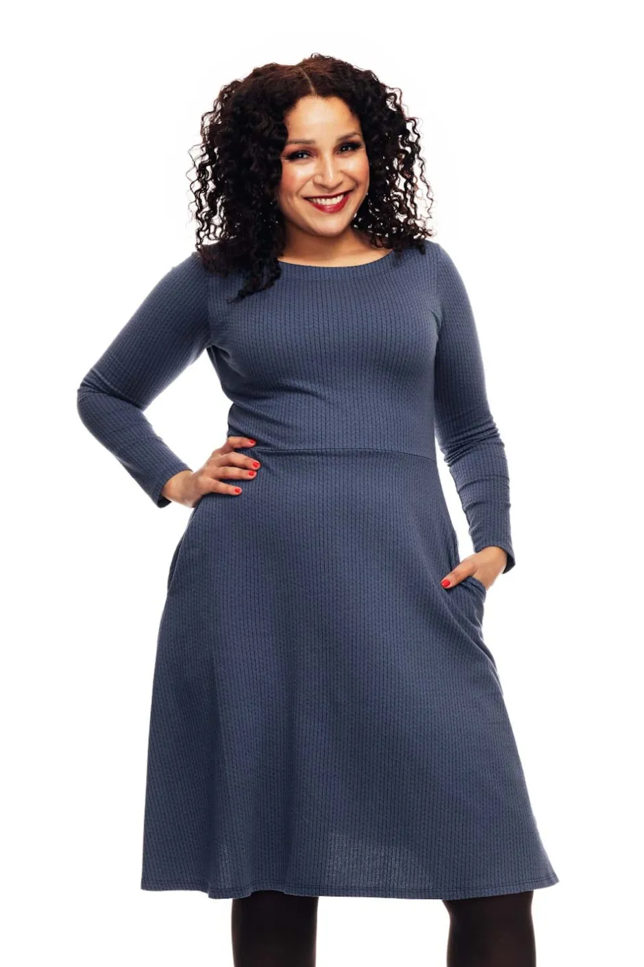 Långärmad klänning med figurnära liv och vid kjol. Båtringad, längd till strax nedanför knät och självklart fickor i sidan.