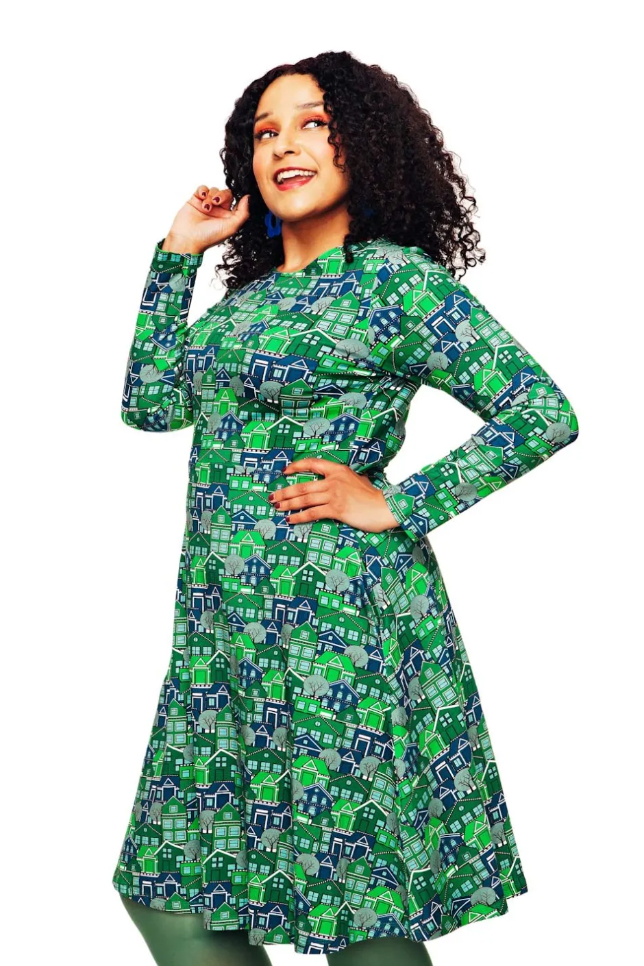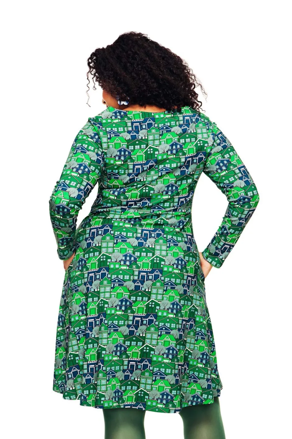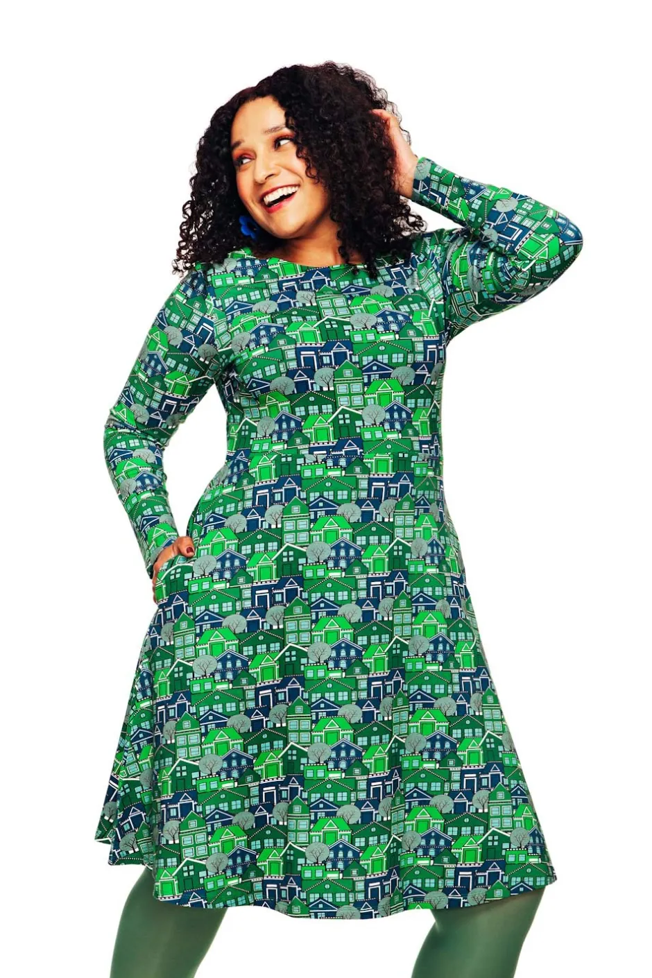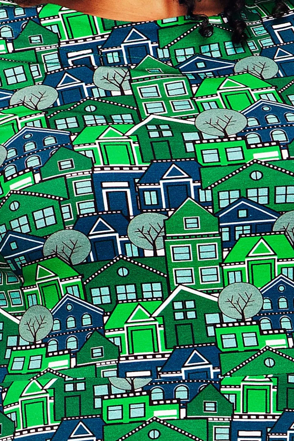 Tyget heter Vår gata grön och är en stadsbild med hus och träd i olika nyanser av grönt och blått med detaljer i vitt och svart.