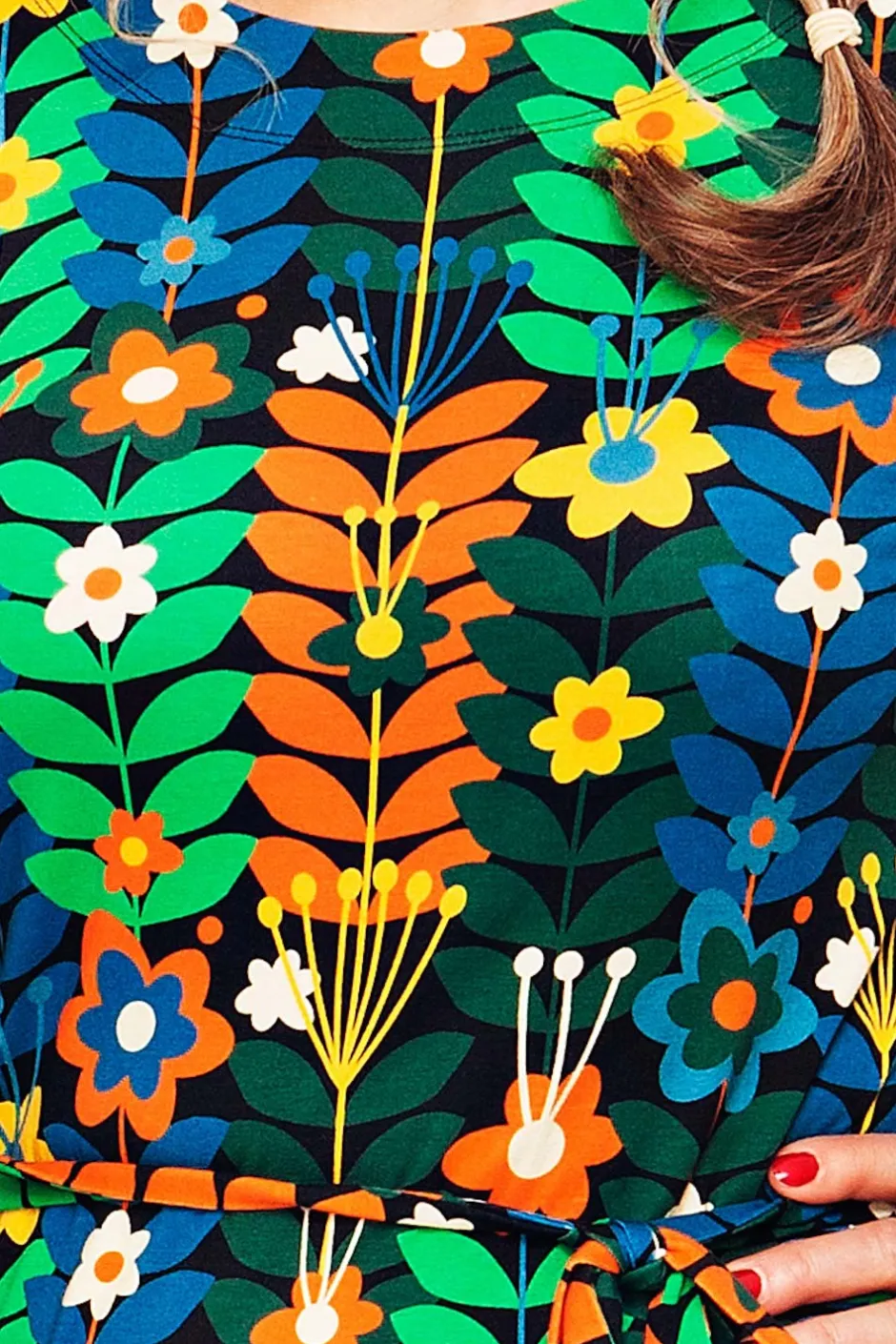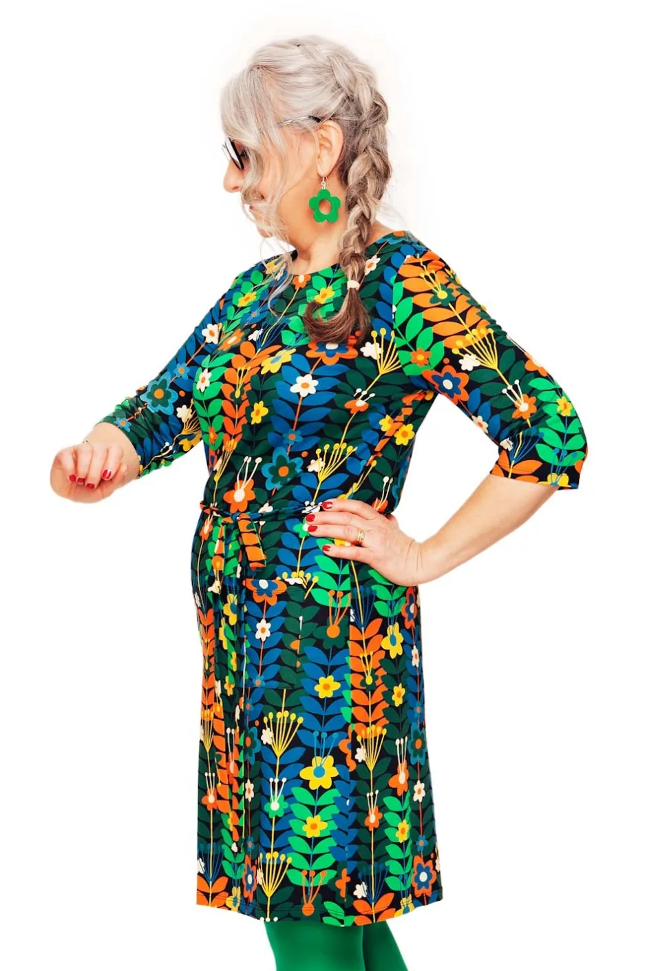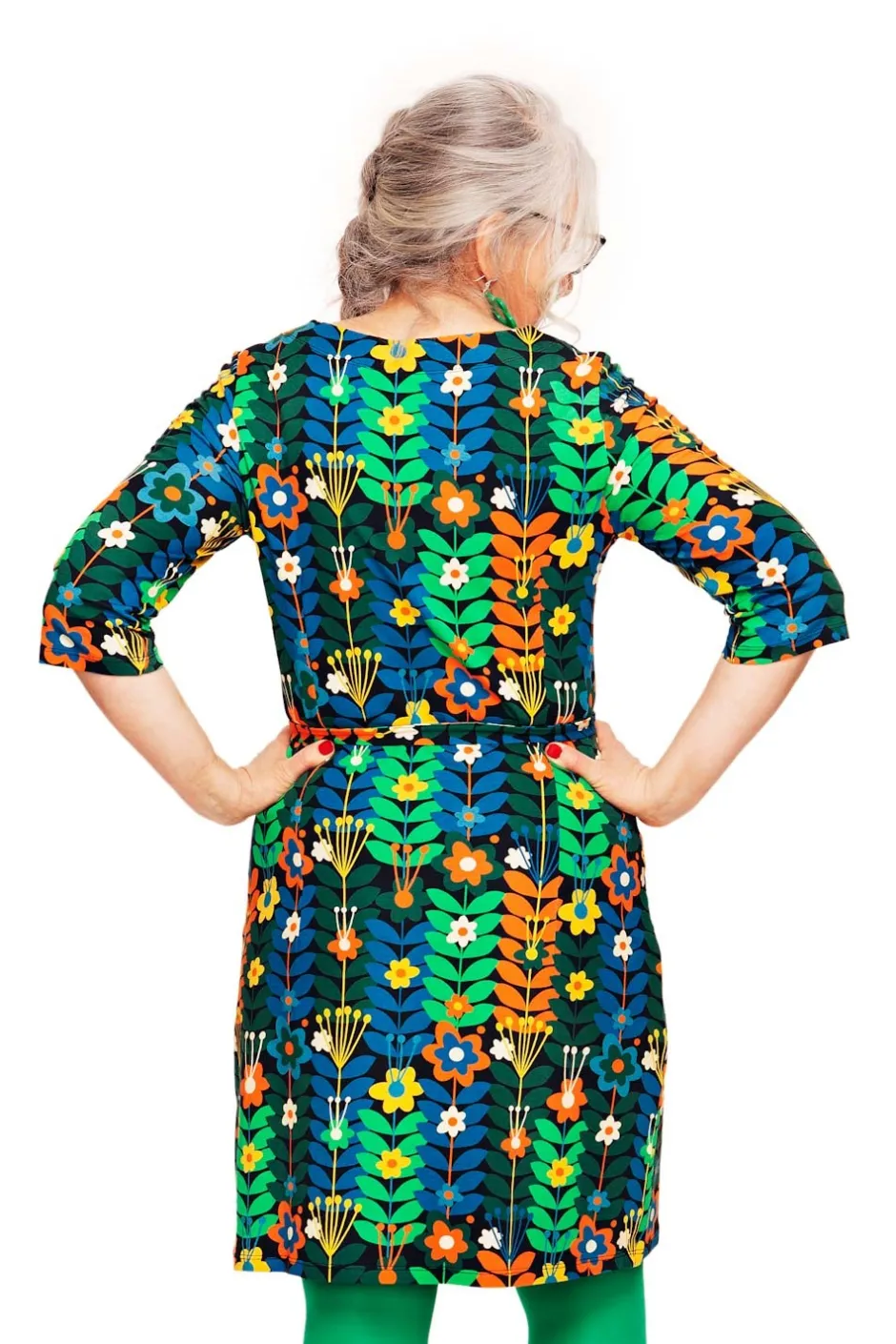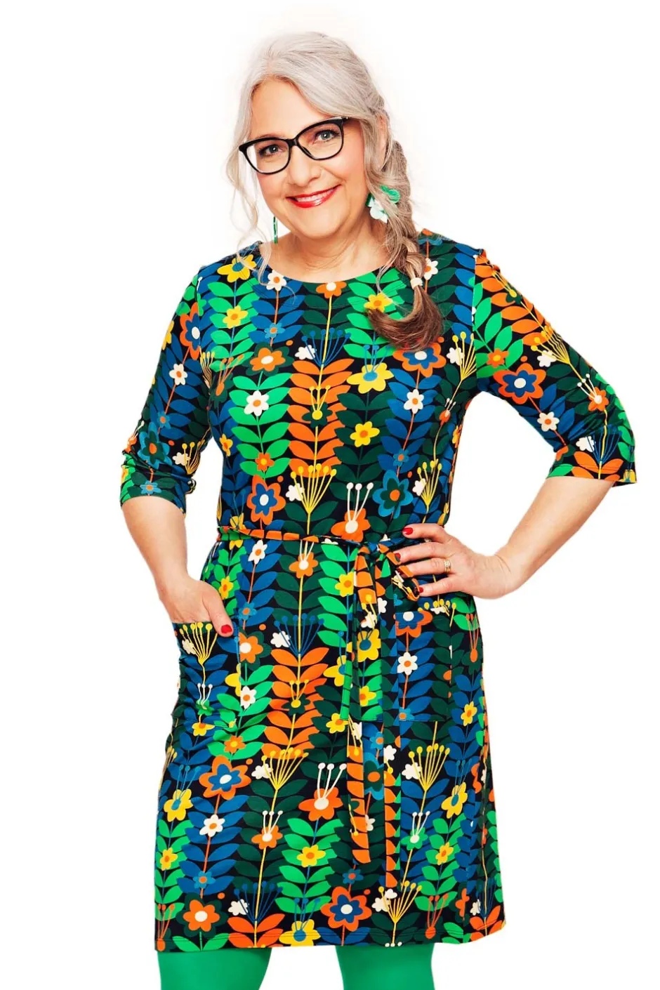 Doris är en A-formad trikåklänning med inspiration från 60-talet. Modellen är nättare upptill med lösare passform nedtill, har trekvartsärm och påsydda fickor fram. Tillhörande band kan knytas i midjan.