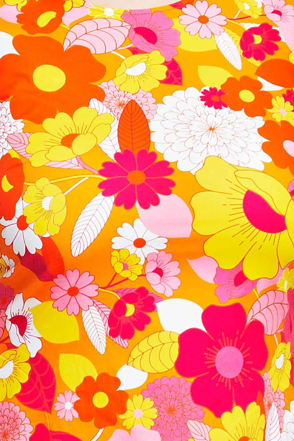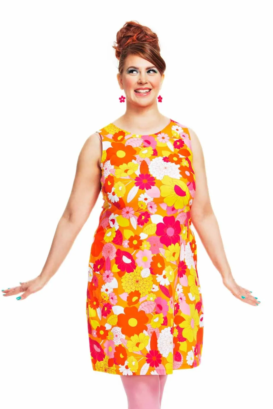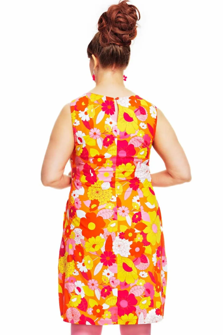 Rut är en av Cissi och Selmas första klänningsmodeller, en riktig klassiker inspirerad av 60-talet! Rut är en ofodrad klänning i lätt bomullsväv med lite stretch i. Modellen är A-formad, nättare upptill och vidare nertill. Klänningen har ingen dragkedja utan är istället designad med sprund i nacken med knapp för att klänningen lätt ska kunna träs över huvudet. De dolda fickorna i sidan har en dekorativ stickning som löper längs fickans utsida. Tyget heter Glädje och har en orange botten med gula, orange, rosa och vita blommor. Tyget heter Glädje och har en orange botten med blommor i gult, orange, rosa och vitt.