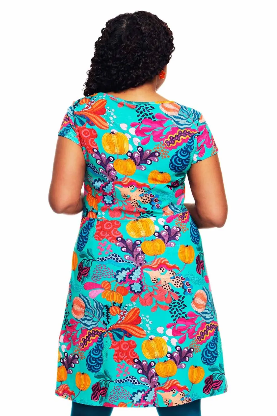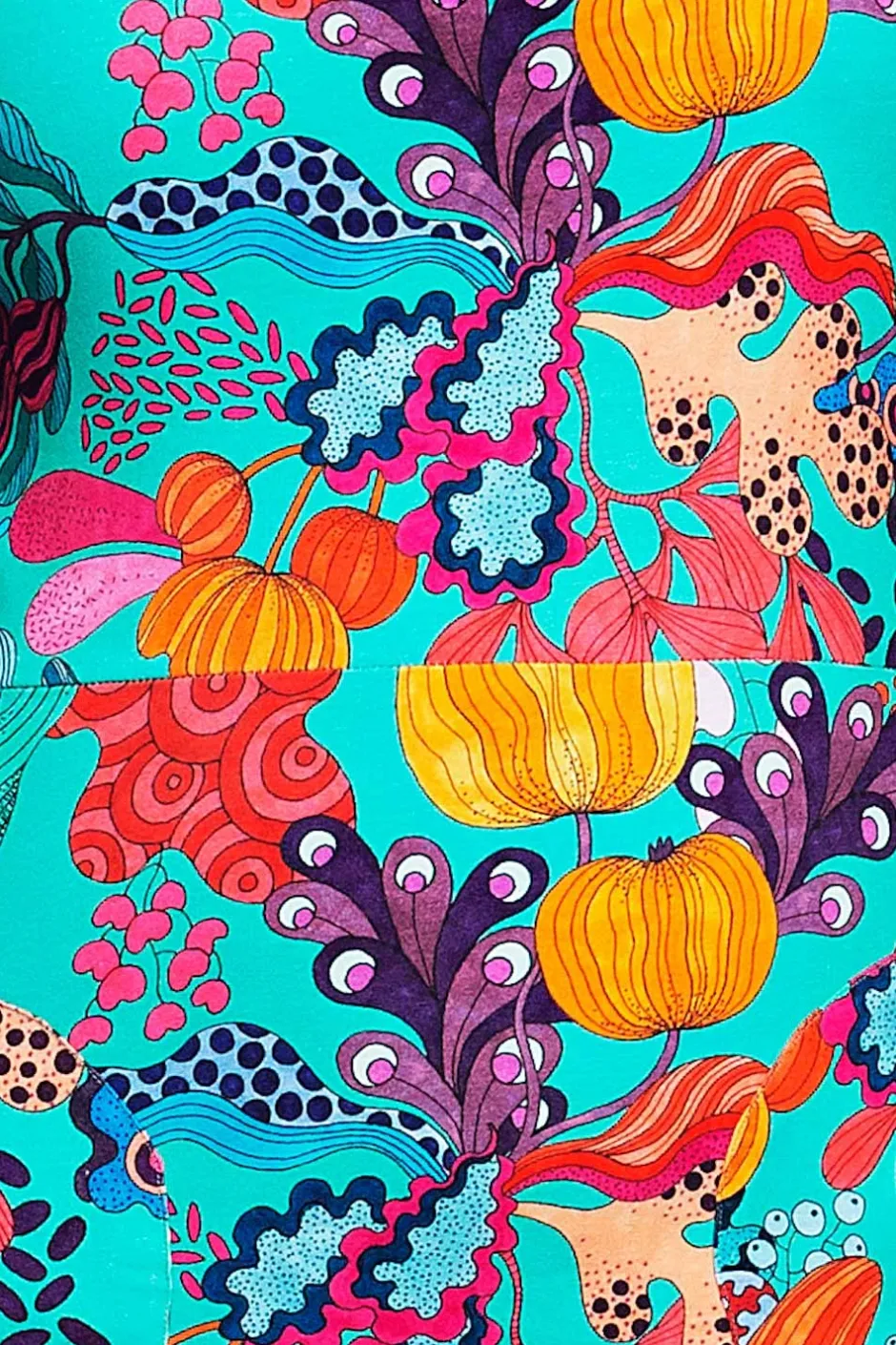 Tyget heter Kazoo Turkos och har en turkos botten med ett mönster i petrol, lila, blå orange och rosa. Mönstret är designat av Framiadesign.
