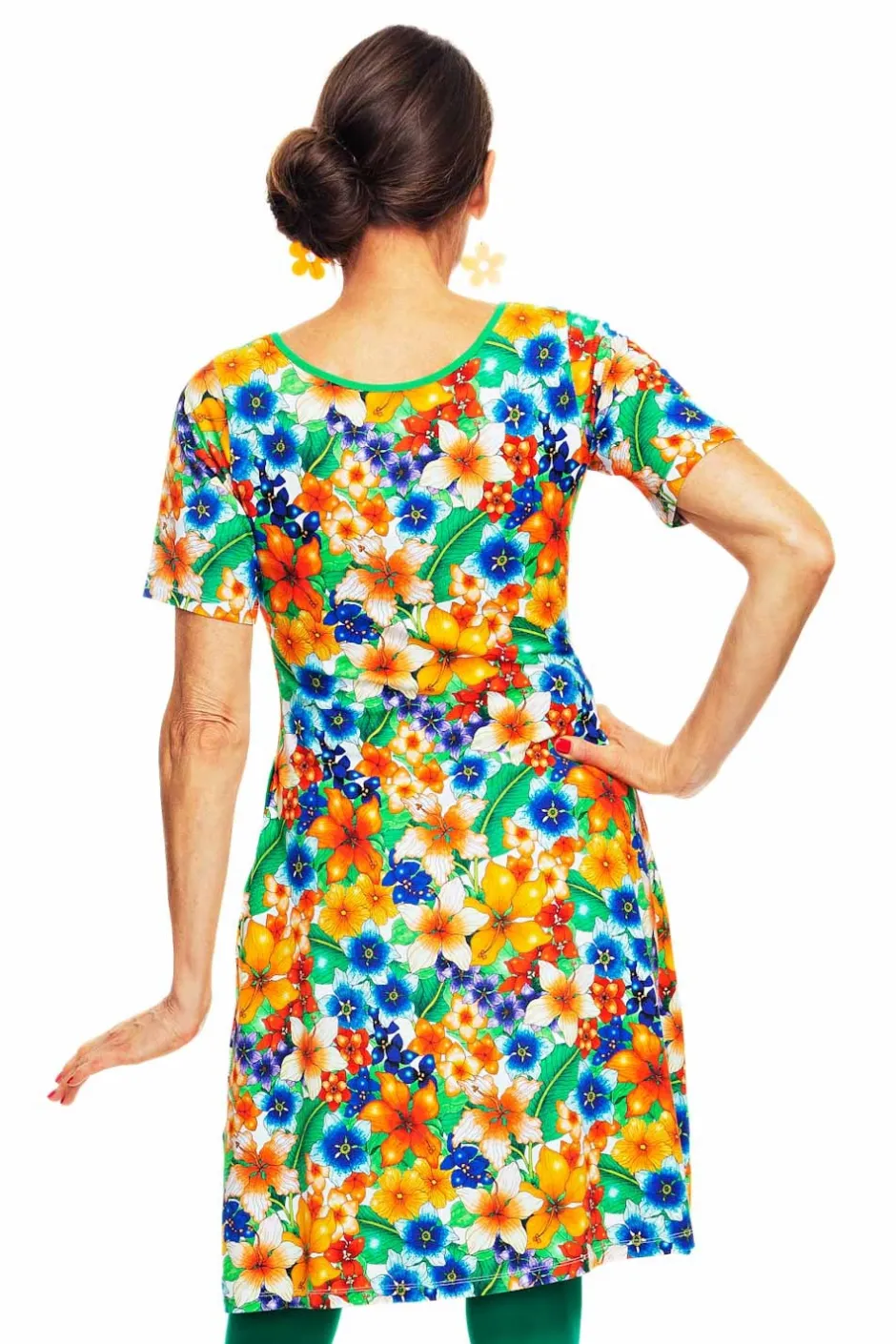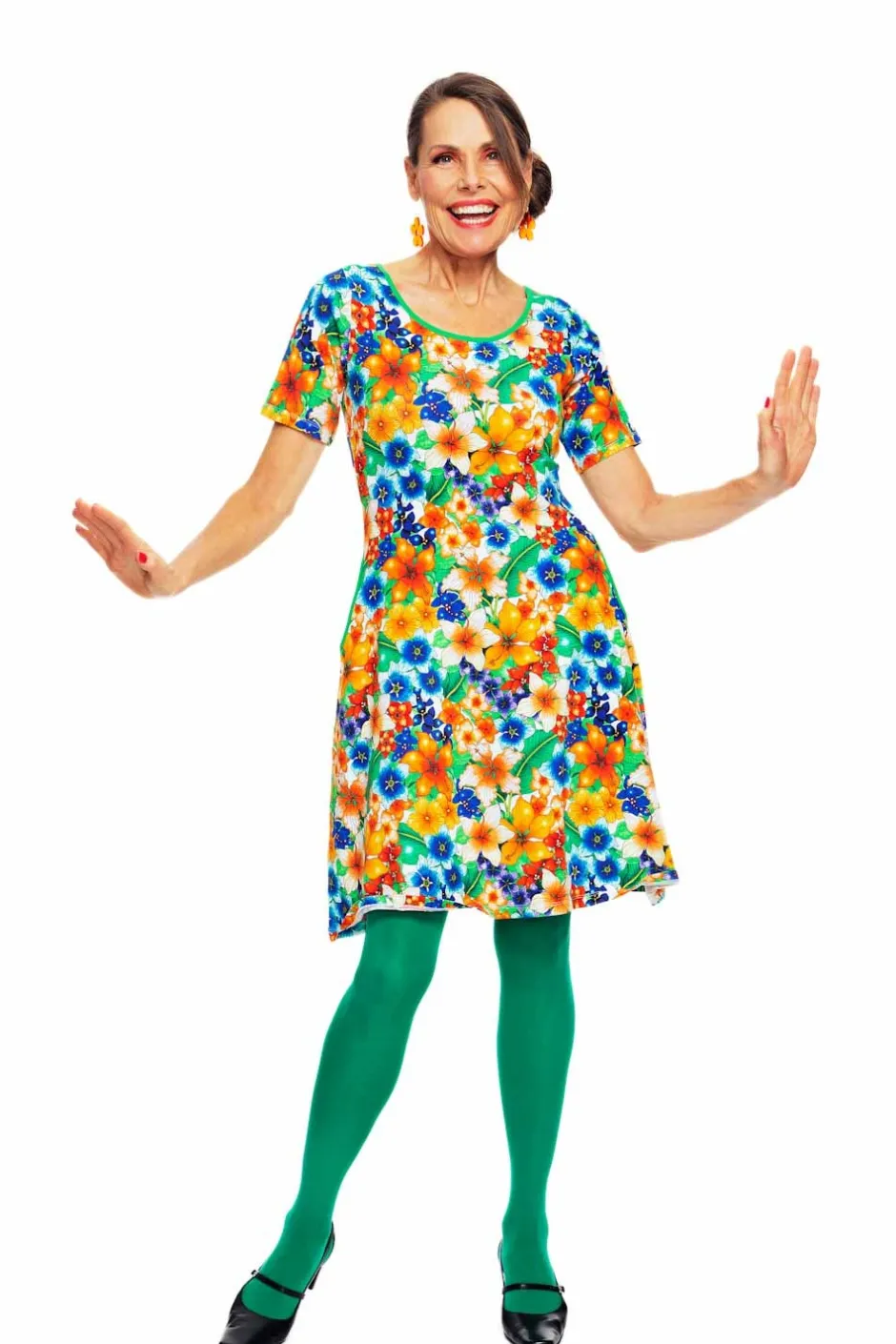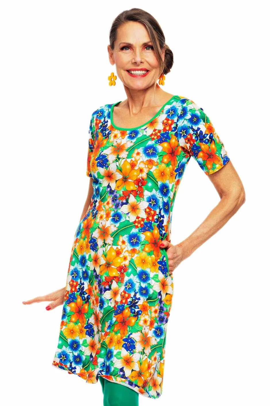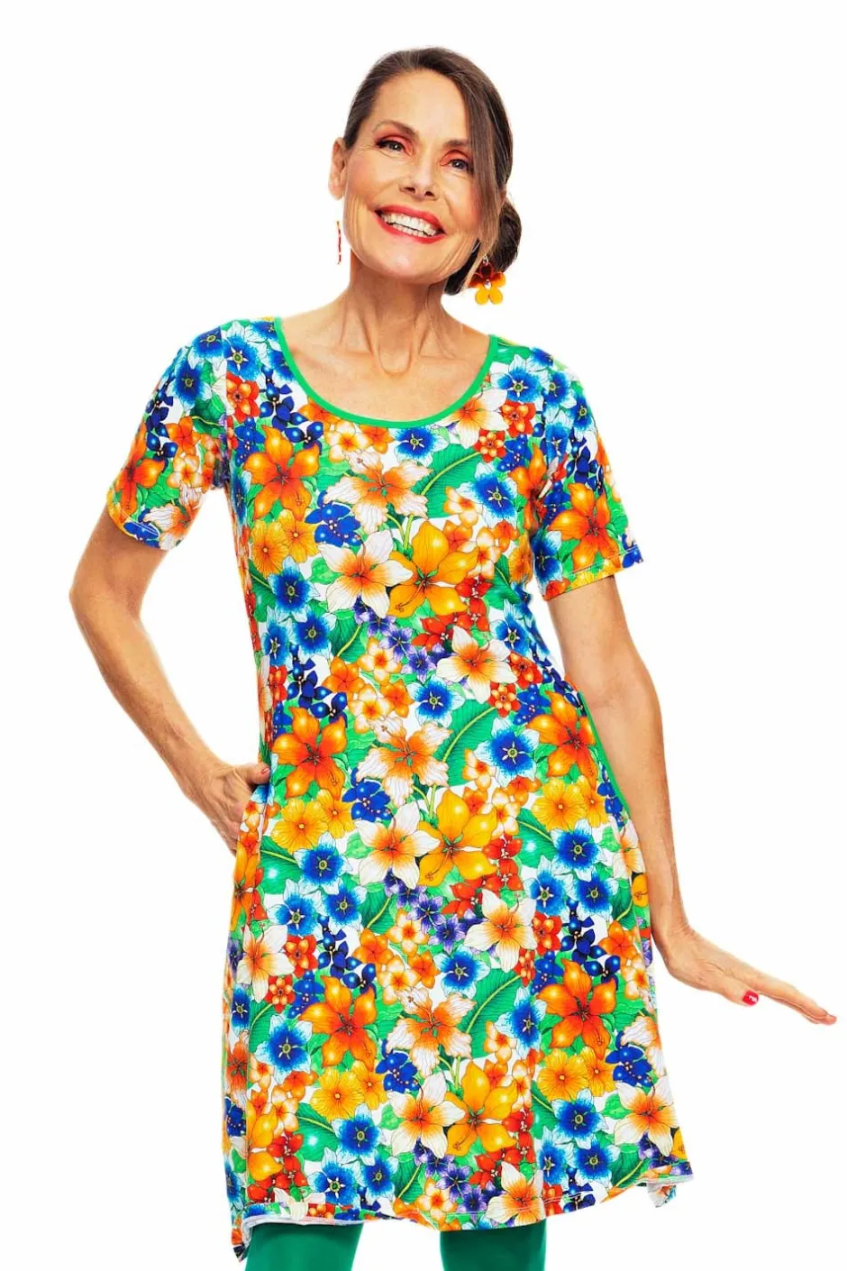 Magda är en trikåklänning utan skärningar med lite vidd i kjolen och perfekt ärmlängd. Klänningen har en elegant halsringning och fickor i sidorna med kontrasterande kantband. Tyget heter Blomster Orange och har blommor i färgerna orange, röd, gul, blå, och gröna blad.