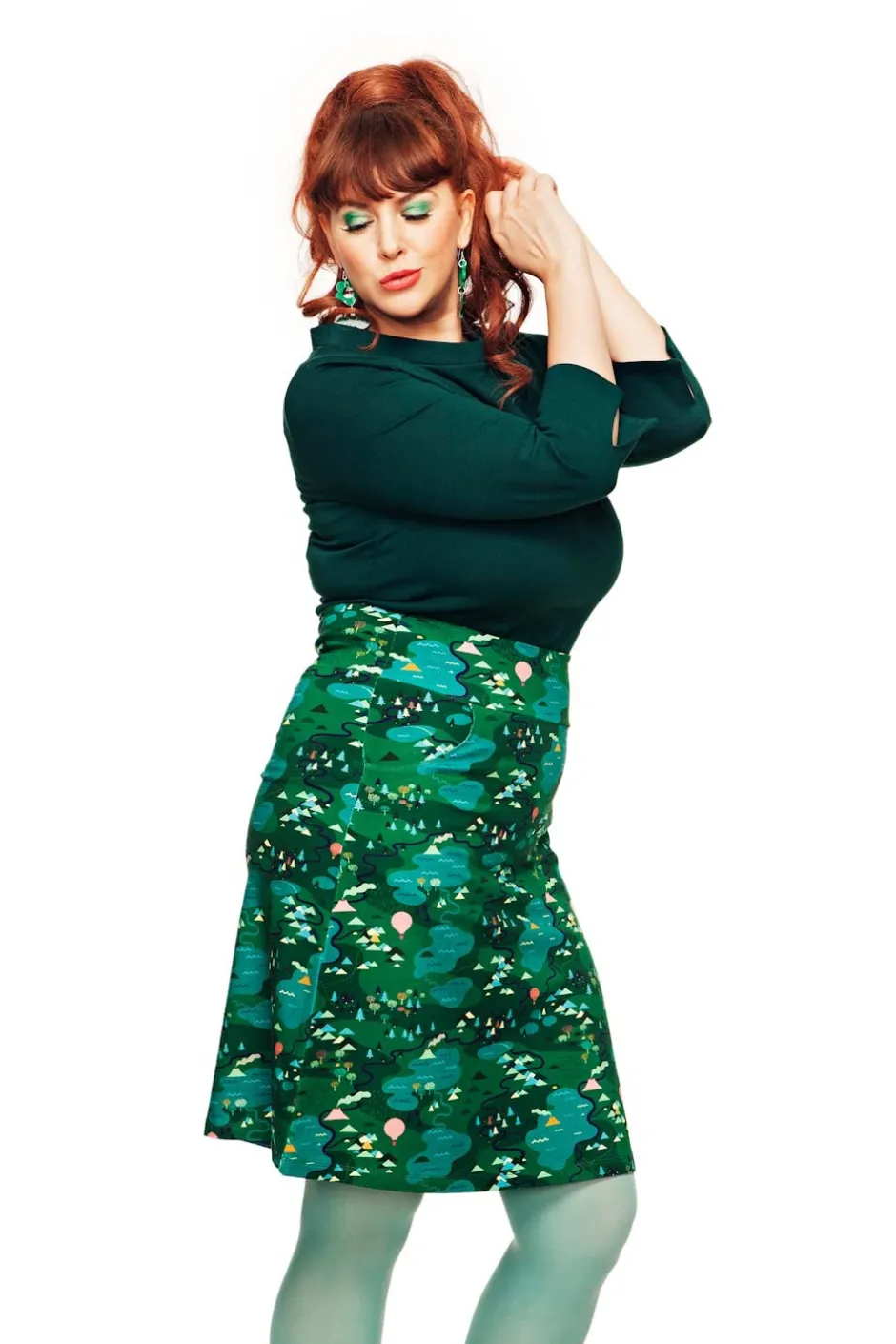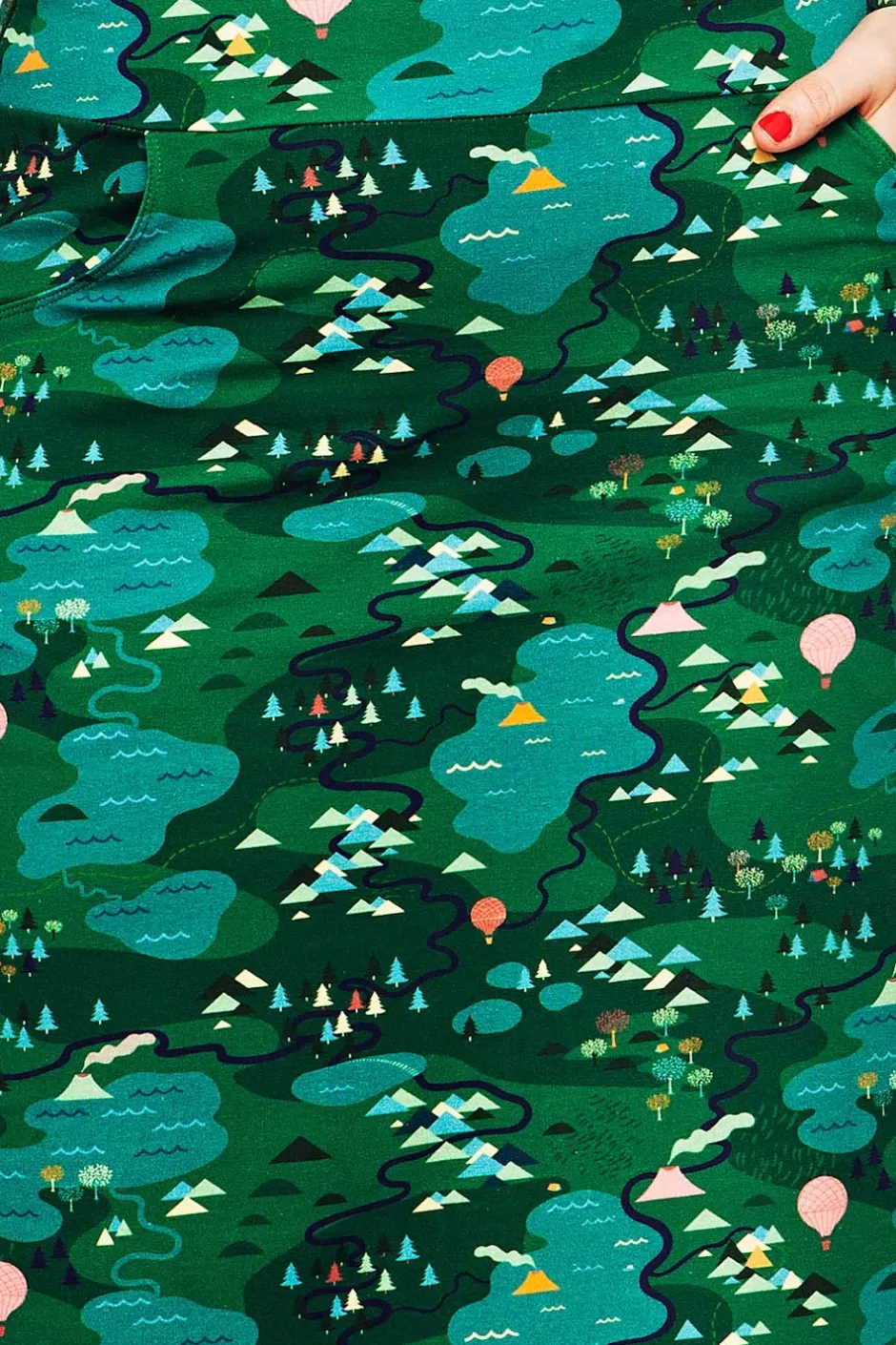Tyget heter Äventyr och är ritat av Vera Kindgren. Ett lekfullt mönster med borgar och dalar insjöar, skogsdungar och rykande vulkaner. På en grön bottenfärg utspelar sig äventyret i detaljer i rosa, orange, turkost och ljusgrönt.