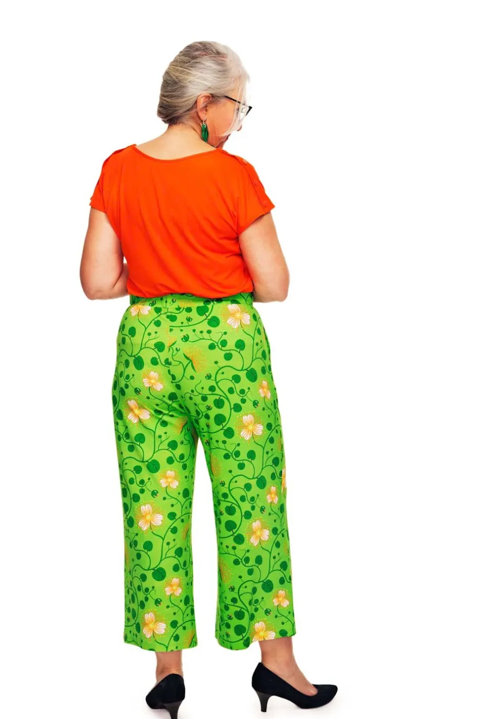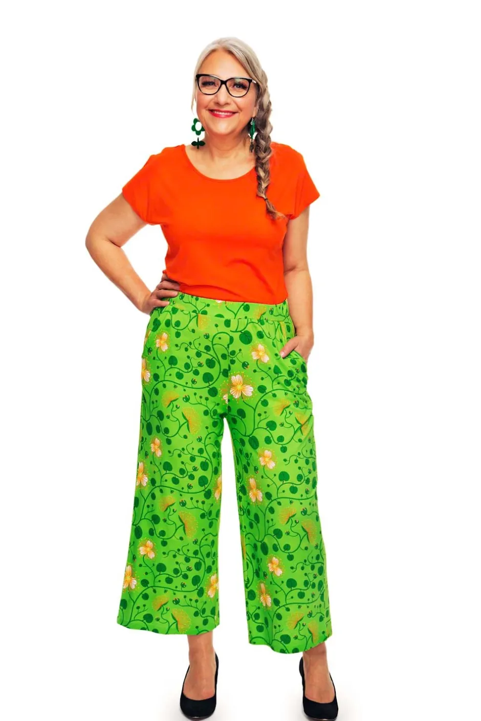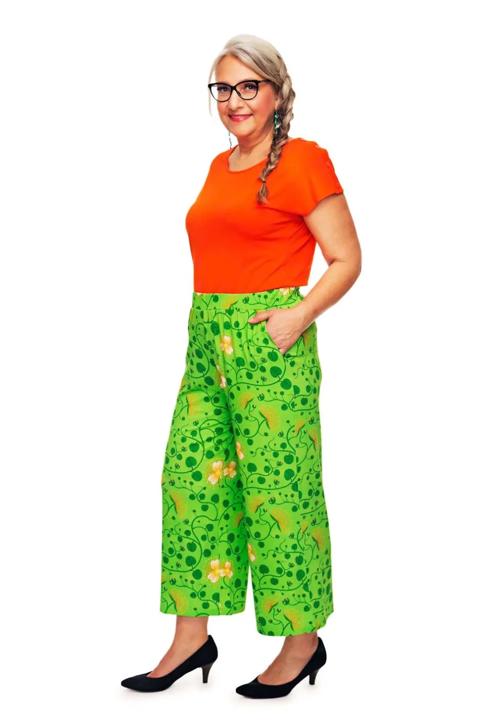 Molly är bekväma byxor i mjuk och stretchig viskostrikå med resår i midjan och självklart, fickor!