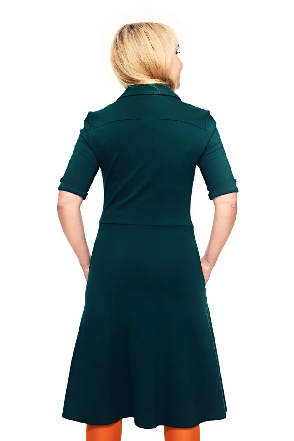 Monica är en skjortklänning i trikå. Modellen är inspirerad från 70-talet och har fina detaljer med knäppning fram, ärm med uppvik och knapp, krage med slag och påsydda fickor. En klänning att känna sig både bekväm och uppklädd i!