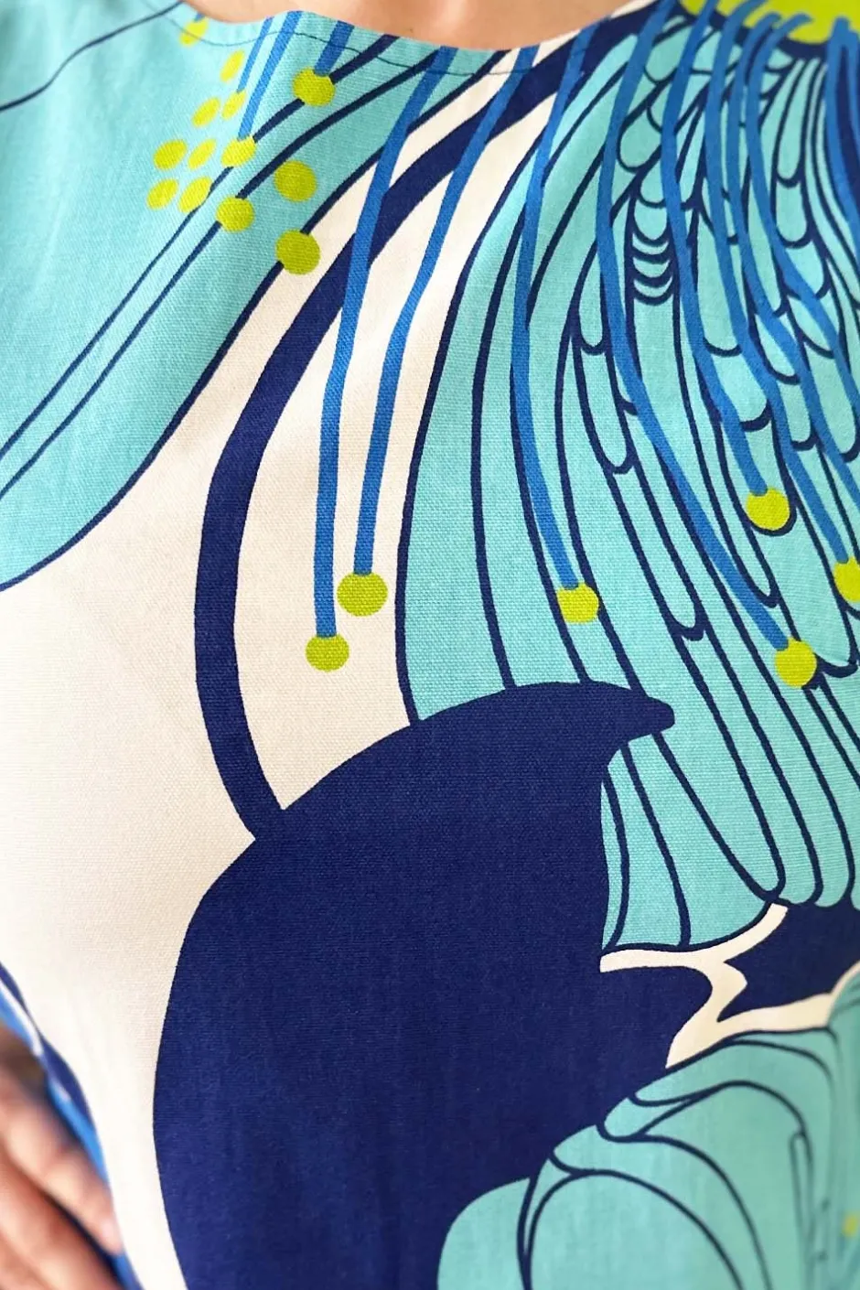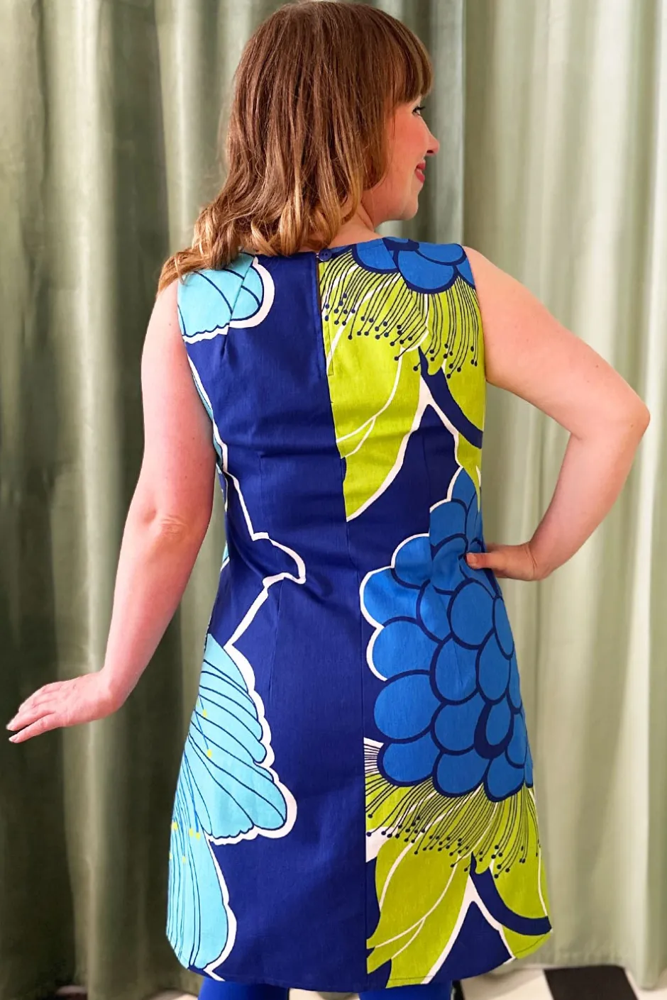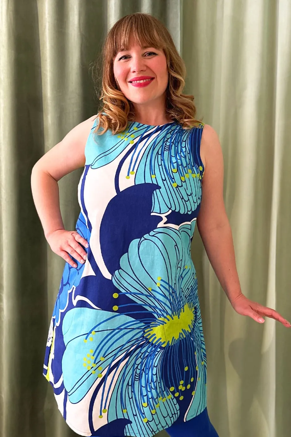 Rut är en av Cissi och Selmas första klänningsmodeller, en riktig klassiker inspirerad av 60-talet! Modellen är A-formad, nättare upptill och vidare nertill. Klänningen har ingen dragkedja utan är istället designad med sprund i nacken med knapp. De dolda fickorna i sidan har en dekorativ stickning som löper längs fickans utsida. Tyget heter Retro blå. Det är stormönstrat med blommor i olika blå toner, limegrönt och vitt. Tyget är ett resttyg som har fått ett nytt liv.