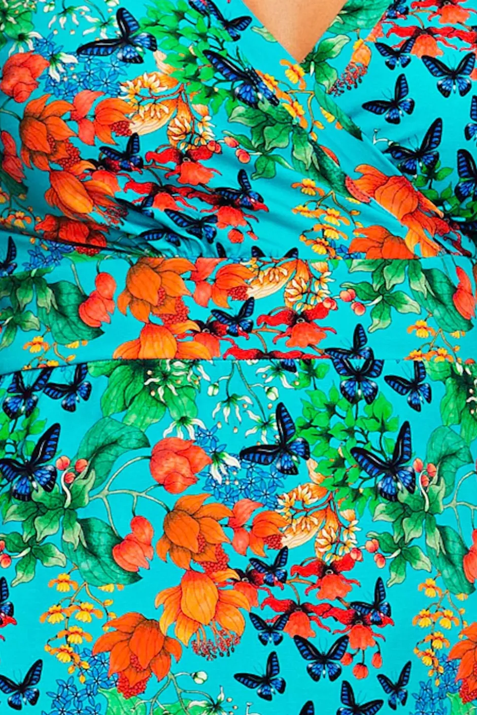 Tyget heter Fjärilar och har en ljusblå botten med fjärilar i röd och mörkblå.