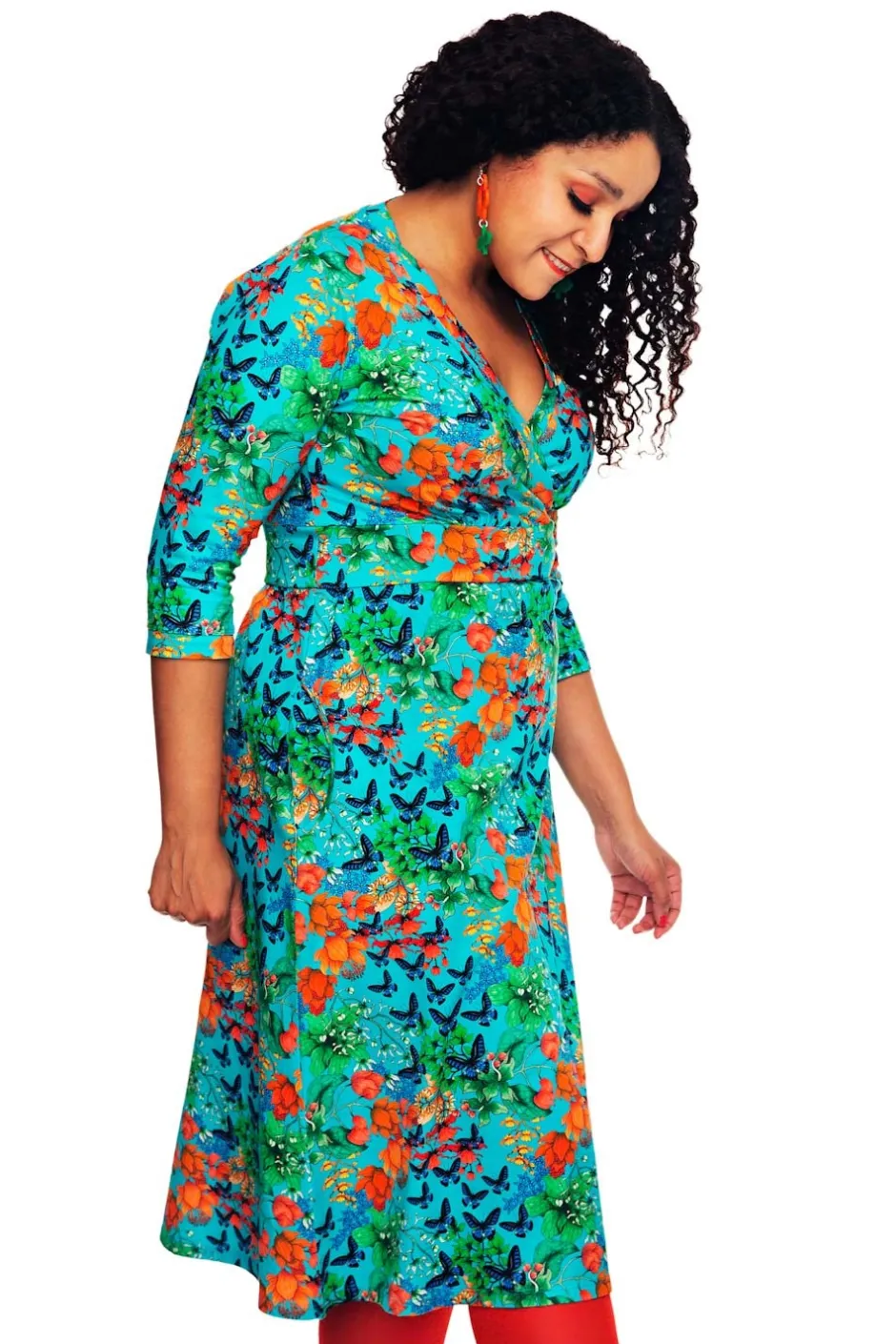 Vera är en välarbetad klänningsmodell med fina detaljer. Den har V-formad omlottringning, ett midjeparti och lätt rynkad kjol med fickor i sidorna. Längden är till knät och ärmen går till armbågen.