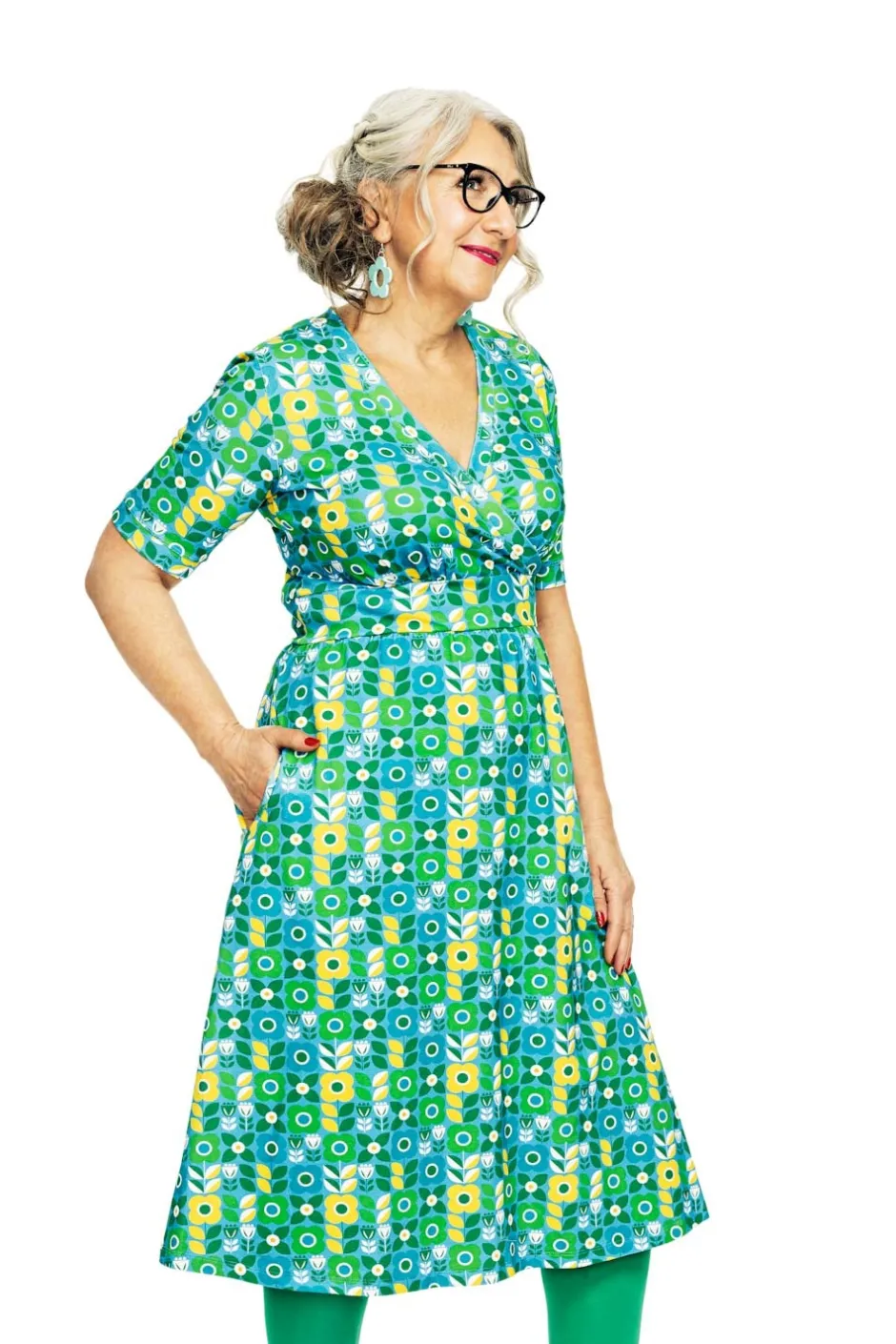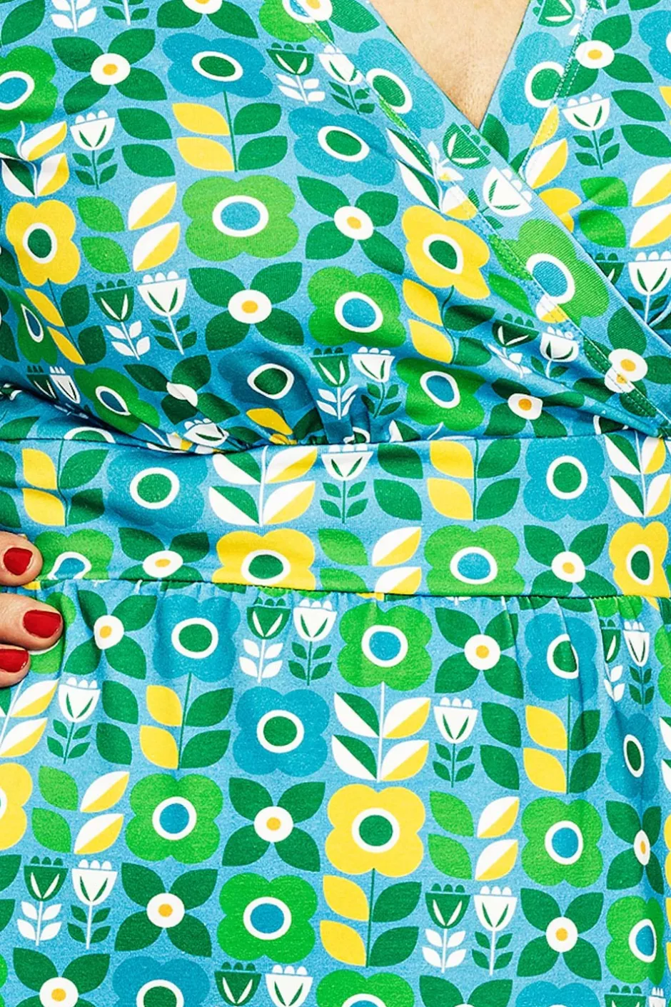 Vivi är en välarbetad klänning med vackra detaljer. Den har en V-formad omlottringning, markerad midja och en lätt rynkad kjol med praktiska sidfickor. Längden går till knät, och ärmen är i klassisk t-shirtmodell.