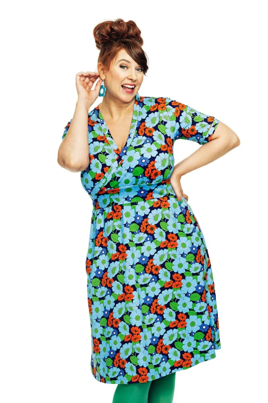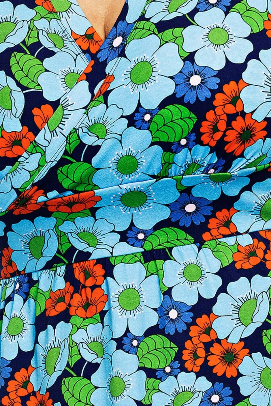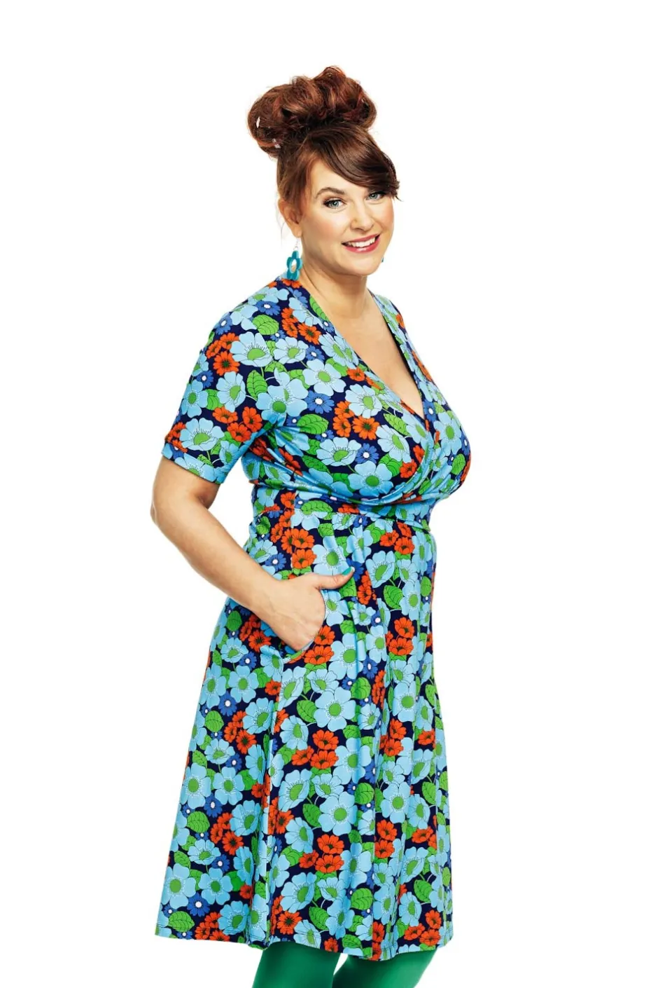 Vivi är en välarbetad klänning med vackra detaljer. Den har en V-formad omlottringning, markerad midja och en lätt rynkad kjol med praktiska sidfickor. Längden går till knät, och ärmen är i klassisk t-shirtmodell.