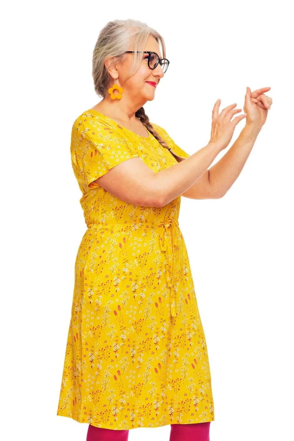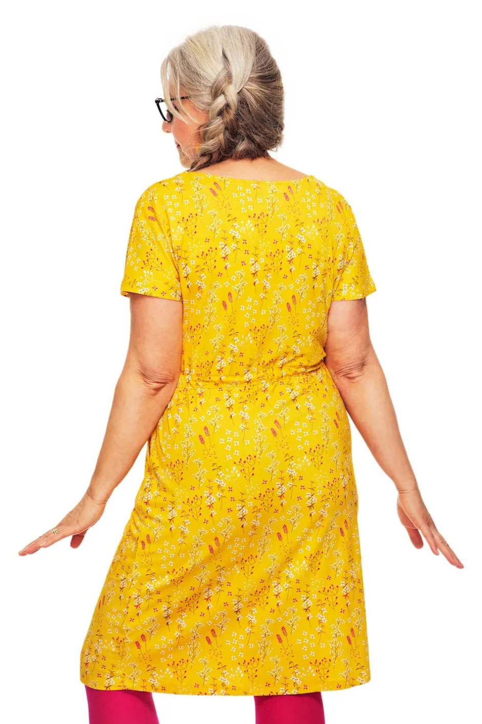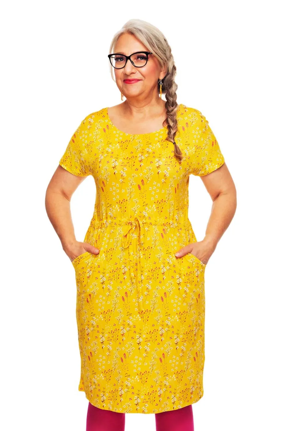 Bella är en avslappnad sommarklänning i mjuk och stretchig viskostrikå med korta ärmar och dragsko i midjan och rund halsringing. Klänningen har fickor.