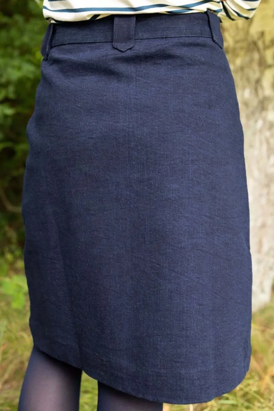 En klassiskt blå denimkjol med linning och knäppning fram som stängs med en tvådelad dragkedja. Jeanstyget är stretchigt och kjolen har praktiska fickor i sidan och skärphällor i linningen.