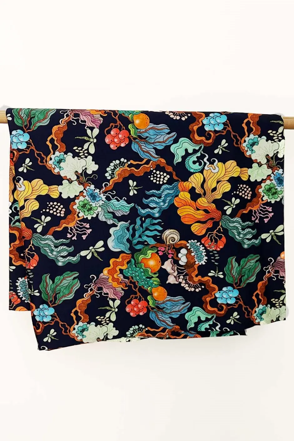 Tyget heter Evighet Blå och har en mörkblå bakgrund med fantasifullt mönster i flera färger. Det är ett mjukt och stretchigt tyg i trikå som passar att sy klänningar, toppar, barnkläder mm.