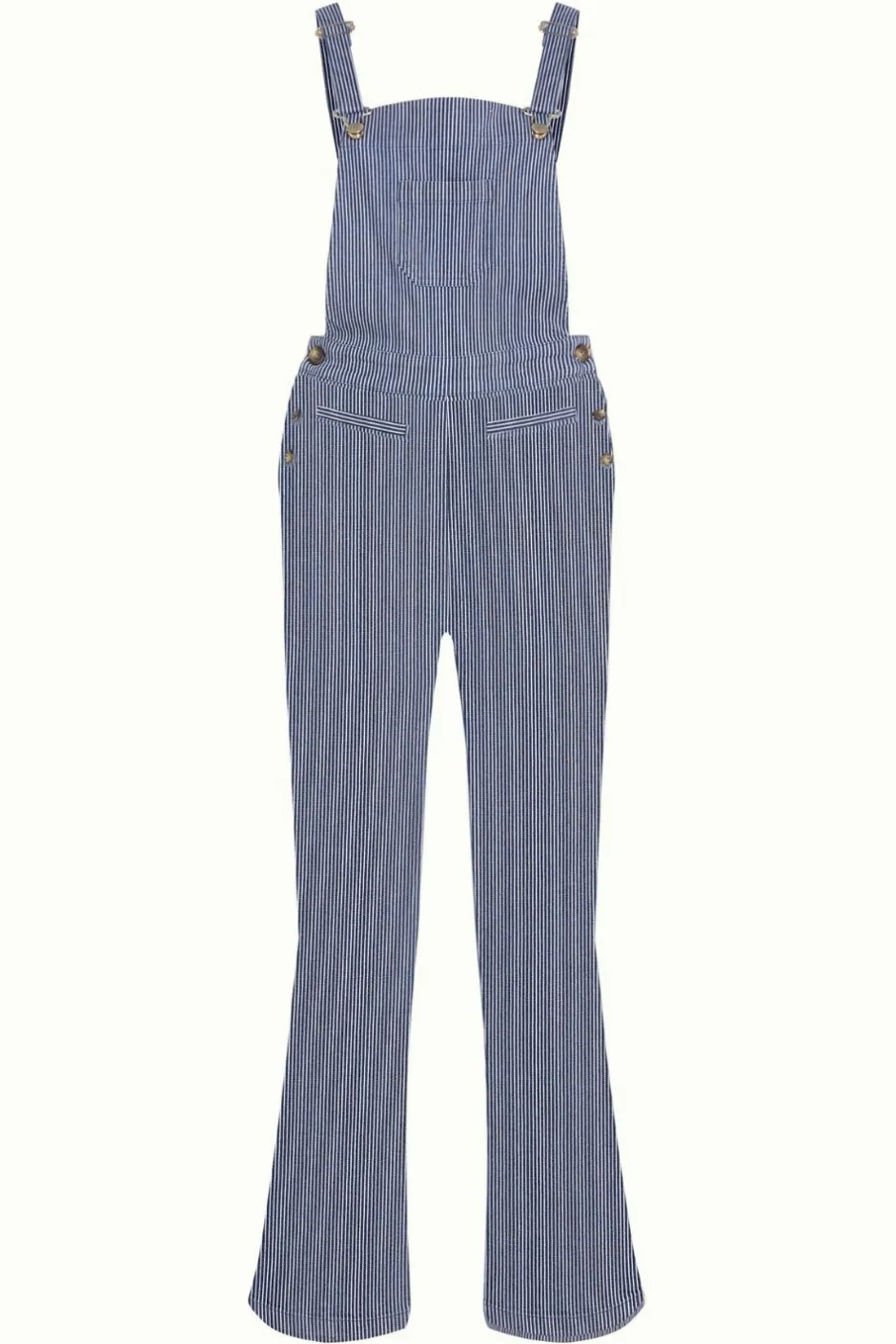 Randig hängselbyxa från holländska märket King Louie. Byxan har något utsvängda ben welt-fickor framtill och patchficka på baksidan. Knappstängning med spänne. Byxan är sydd i ett vävd denim med komfort stretch.