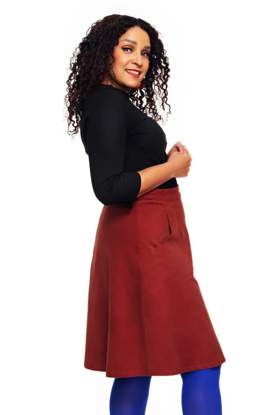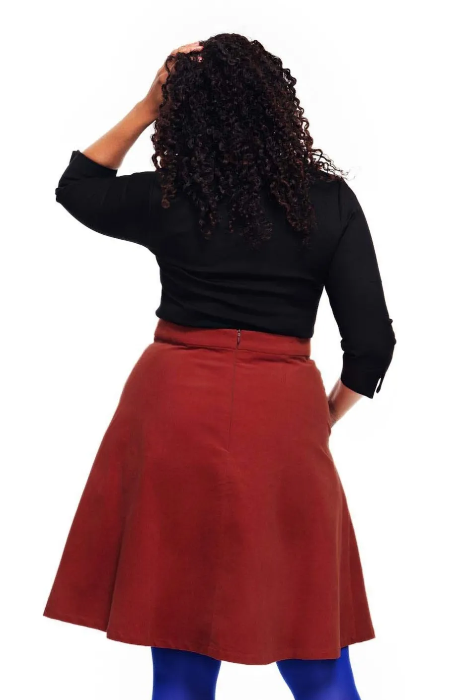 Sonja är en utställd kjol från Cissi och Selma i vävt bomullstyg. Kjolen har linning upptill samt stora synliga fickor fram. Kjolen är fodrad så att den inte hänger upp sig på strumpbyxorna och är lätt att komma i och ur med dragkedja mitt bak.