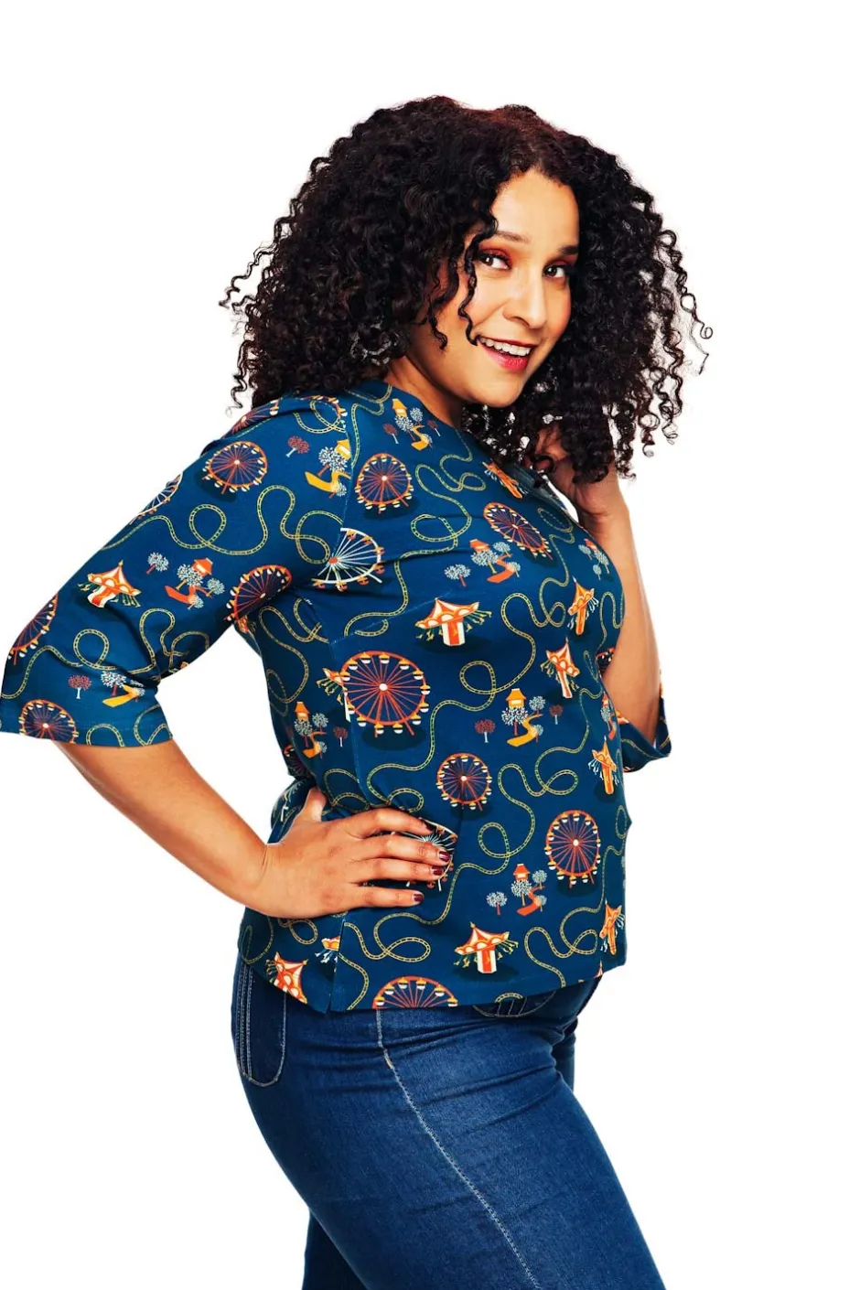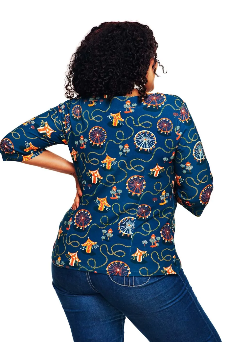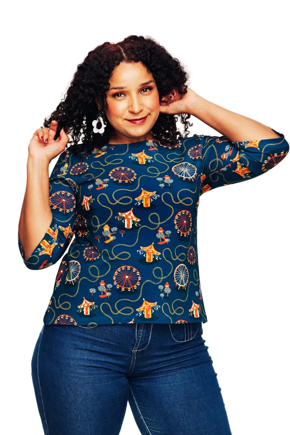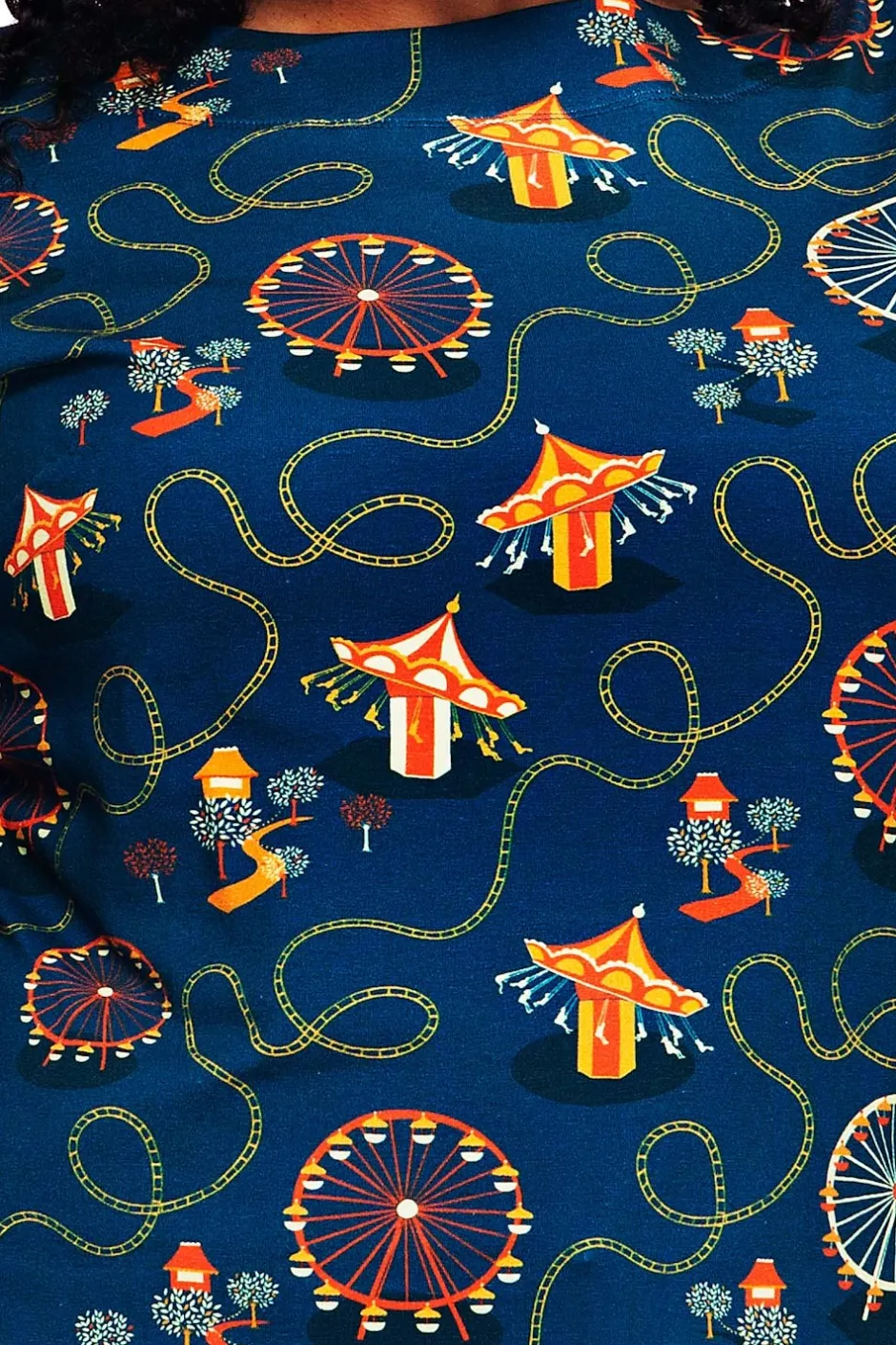 Tyget heter Tivoli Petrol och är ritat av Vera Kindgren. Ett glatt mönster med snurrande karuseller och böljande berg-och-dalbanor. Färgerna går i petroleum, orange och gult.